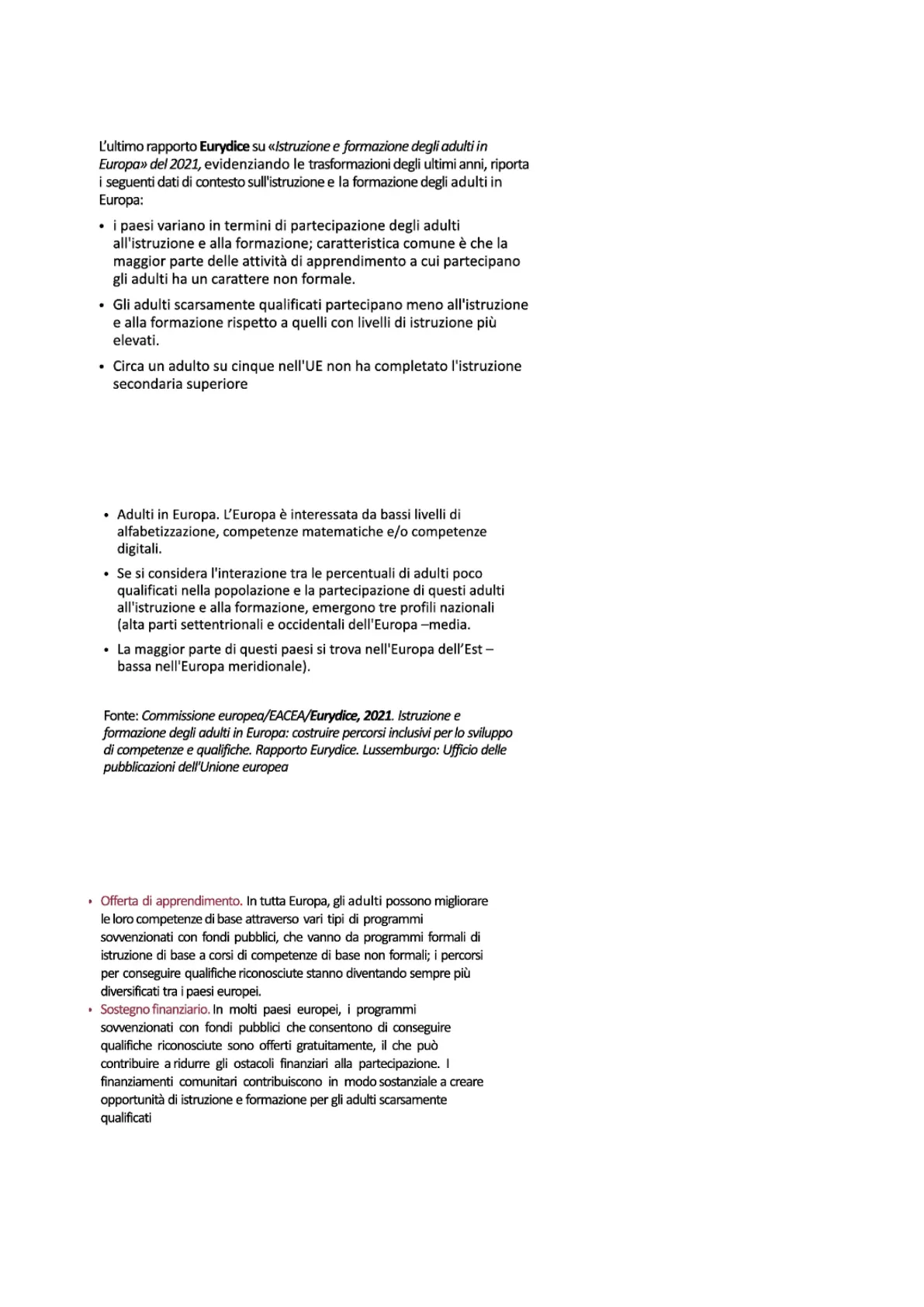 L'ultimo rapporto Eurydice su «Istruzione e formazione degli adulti in Europa» del 2021, evidenziando le trasformazioni degli ultimi anni, riporta i seguenti dati di contesto sull'istruzione e la formazione degli adulti in Europa: