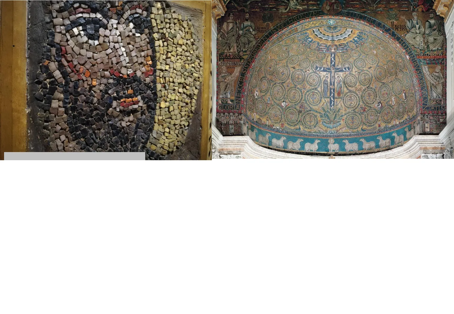 Foto S. Di Guardo - mostra Roma Medievale 2023 Anche l'arte del mosaico ebbe una nuova fioritura nel periodo romanico. Questa arte aveva profonde radici in città come Roma, dove si era diffuso negli ambienti imperiali ed aveva avuto successo anche in ambito paleocristiano. Tale tradizione era proseguita grazie alle committenze papali. Il catino absidale di San Clemente a Roma (sopra a des), del XII secolo, mostra un grande rapporto col paleocristiano e i suoi elementi decorativi e simbolici. Nel periodo romanico, i grandi cantieri come San Marco a Venezia e le chiese siciliane sono vere e proprie scuole, aperte a numerosi influssi, per esempio bizantini.a