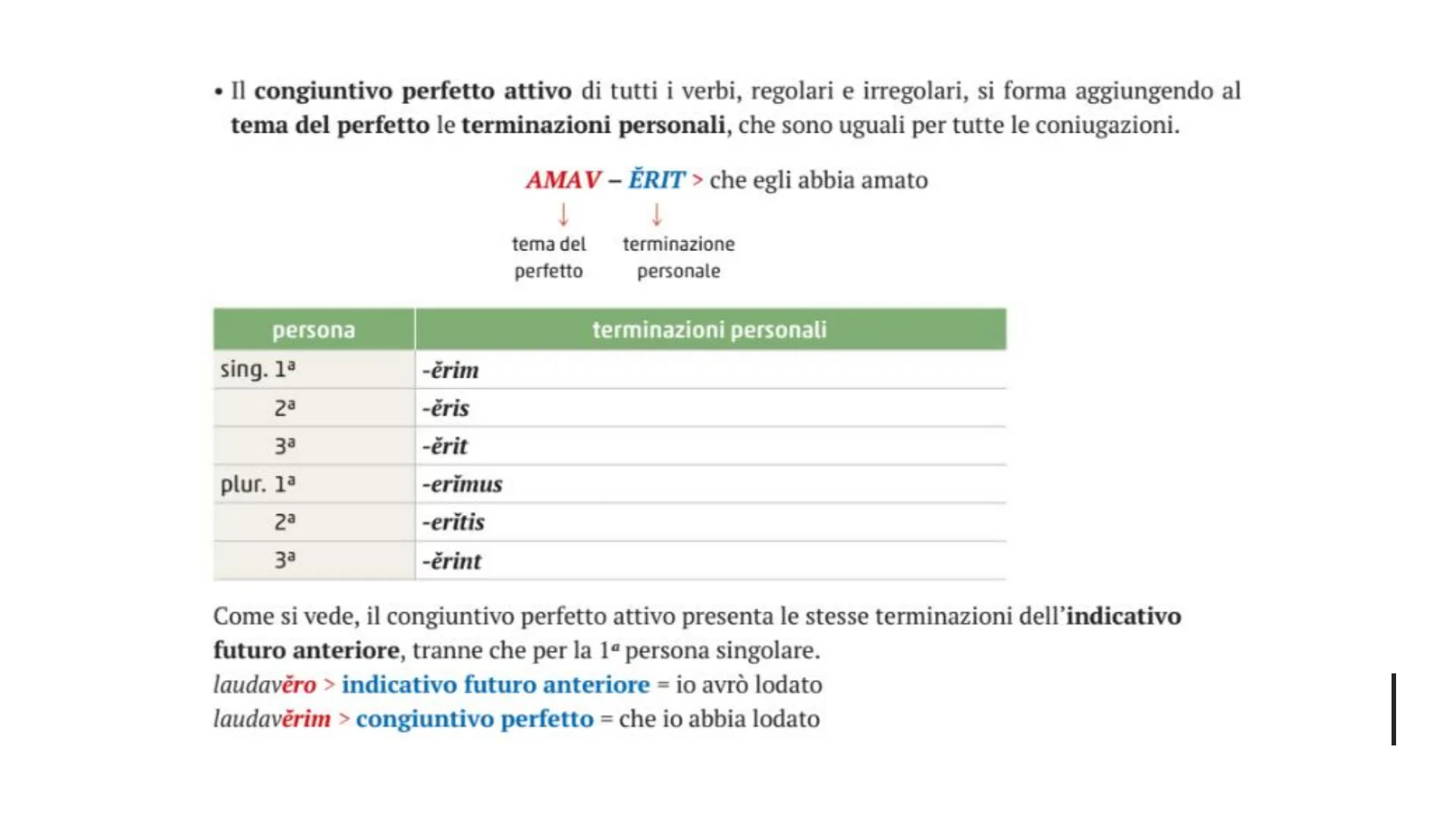 Come si vede, il congiuntivo perfetto attivo presenta le stesse terminazioni dell'indicativo futuro anteriore, tranne che per la 1ª persona singolare.