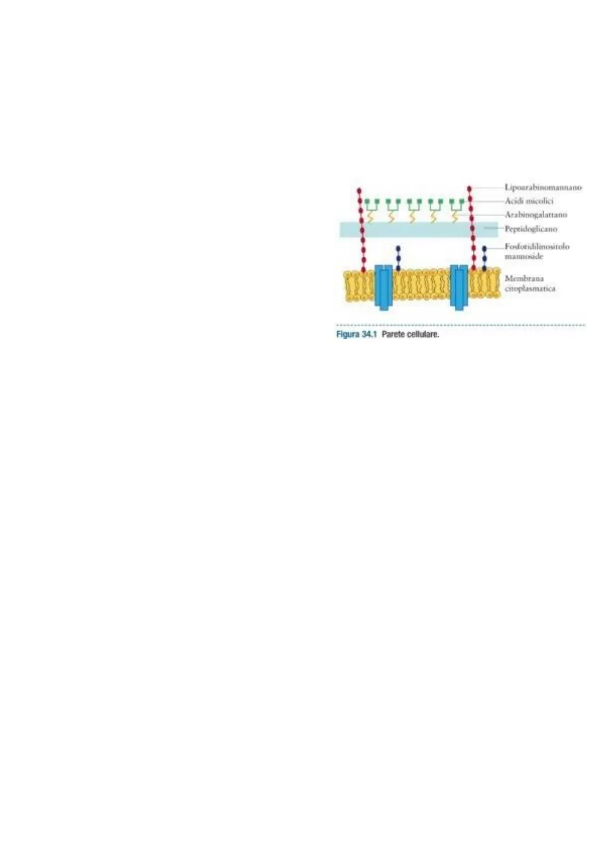 Lipoarabinomannano Acidi micalici Arabinogalattano Peptidoglicano Fosforidilinositolo mannoside Membrana citoplasmatica Figura 34.1 Parete cellulare.