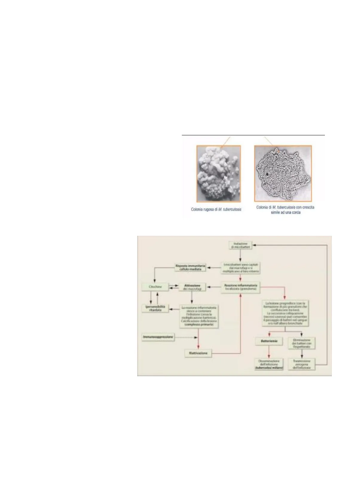 In molti casi, ci sono individui che vengono a contatto col microrganismo, ma avendo un sistema immunitario efficiente sono in grado di sconfiggere il microrganismo, può anche capitare che però esso vinca, riuscendo a penetrare, venendo immediatamente fagocitato dai Macrofagi Alveolari. Una volta all'interno utilizza il LAM, un Lipoglicano di membrana, componente della parete cellulare dei M.Tubercolosis che blocca la fusione del Fagosoma con il Lisosoma, e quindi evitando il killing. In questo caso il microrganismo riesce a sopravvivere e si replica, lisa anche la cellula e può indurre uno stato infiammatorio importante. Vengono richiamati tanti componenti del sistema immunitario con infiammazione localizzata (Granuloma) costituita da Macrofagi, Batteri, cellule Epitelioidi, diversi granulomi genereranno lesioni polmonari, con granulomi sempre più grandi che confluiscono tra di loro, con microrganismi che proliferano sempre meglio e possono diffondere nel sangue con Batteriemia, generando la cosiddetta Tubercolosi Miliare. Ovviamente i microrganismi vanno incontro a diffusione possono essere diffusi da individuo infetto ad individuo sano. Il processo infiammatorio comporta la produzione di una serie di Citochine, quali Interleuchine, Fattore di Necrosi Tumorale Alfa, che a loro volta richiamano anche Linfociti T-killer, fino anche alla produzione di Interferone Gamma, si ha quindi questa forte reazione infiammatoria che in alcuni casi però riesce a contenere l'infezione.