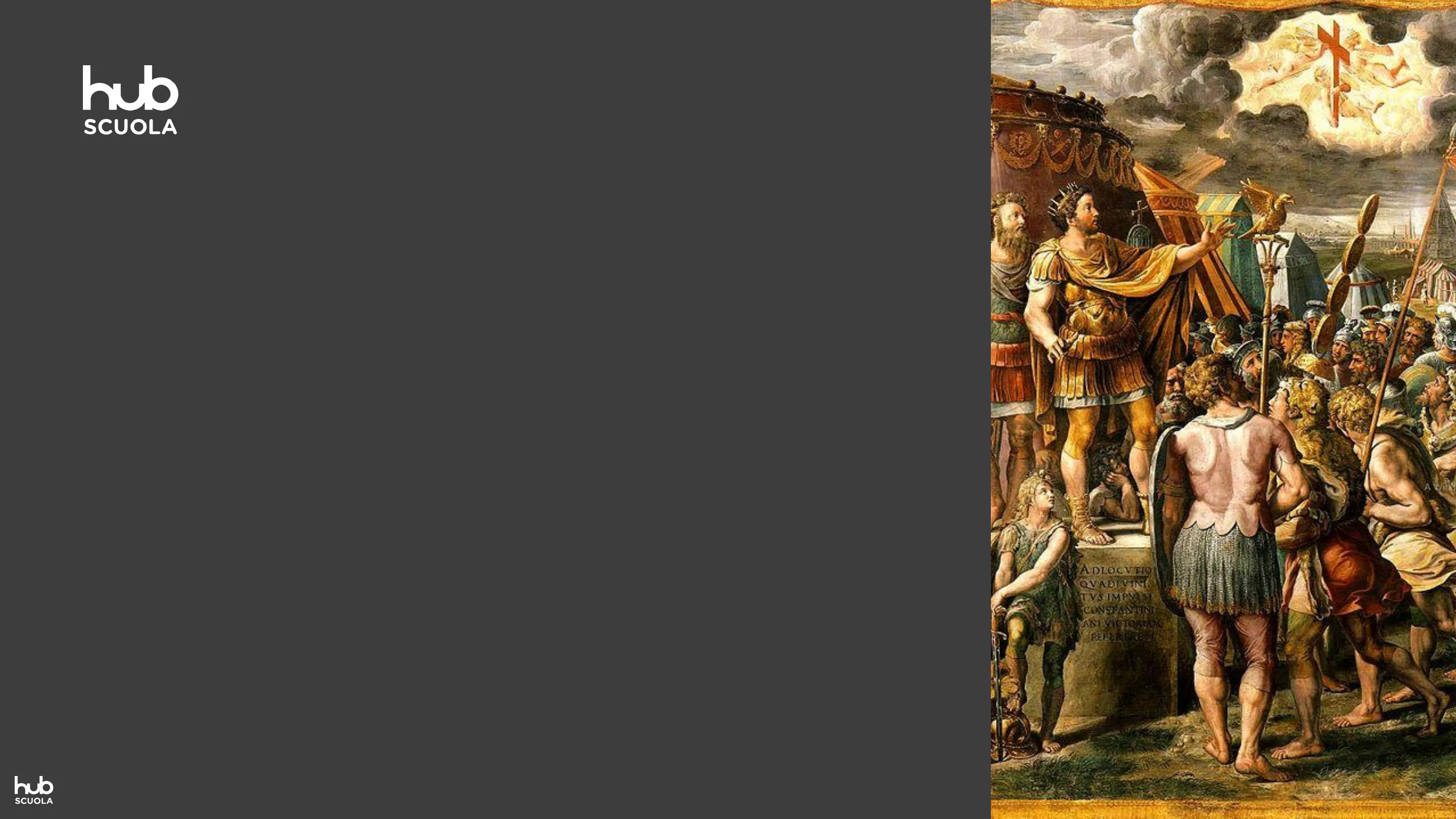 Dopo alcune vittorie in battaglia, come quella di Ponte Milvio che secondo la leggenda è all'origine della sua conversione al cristianesimo, Costantino si afferma come unico imperatore.