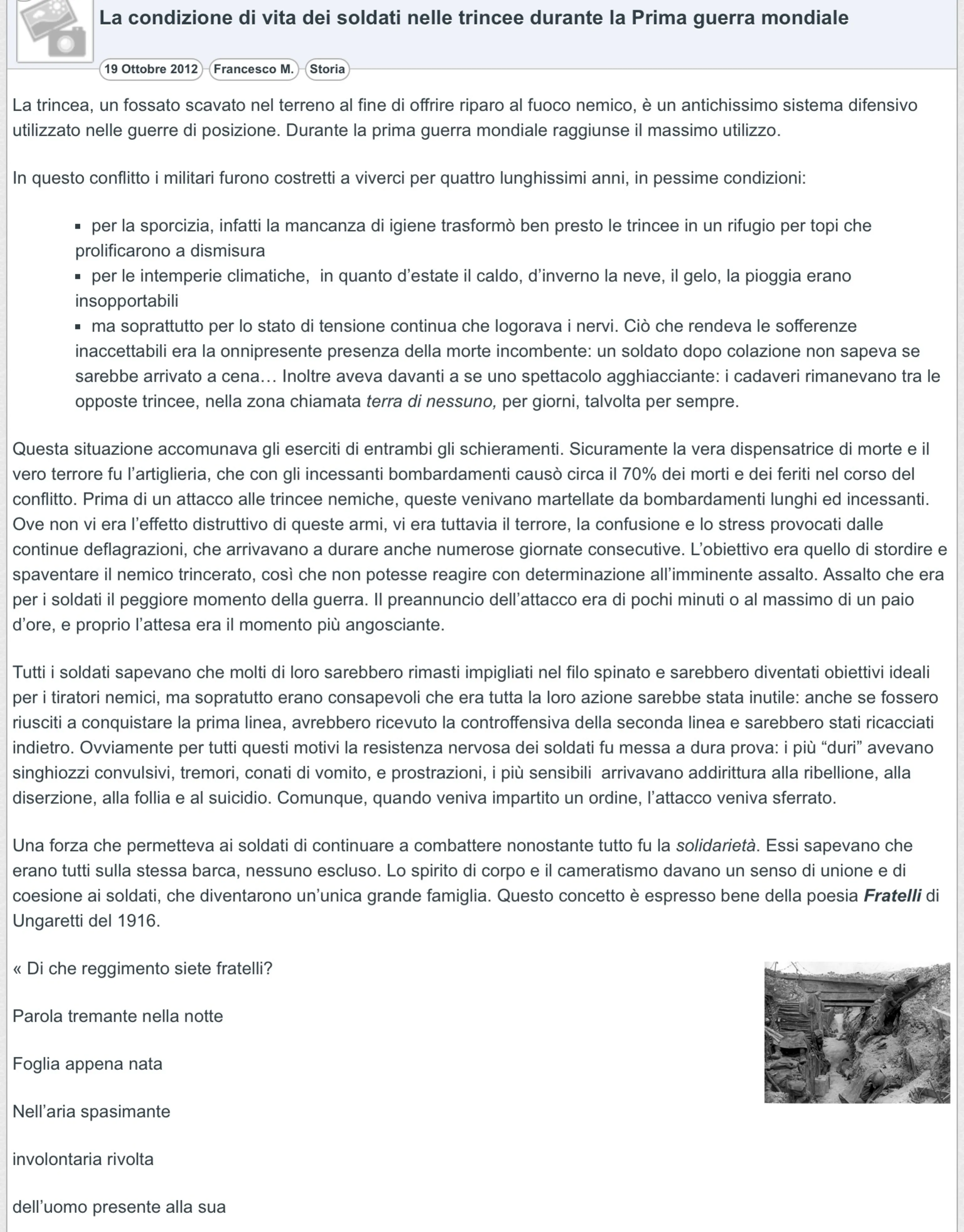 19 Ottobre 2012 Francesco M. Storia La trincea, un fossato scavato nel terreno al fine di offrire riparo al fuoco nemico, è un antichissimo sistema difensivo utilizzato nelle guerre di posizione. Durante la prima guerra mondiale raggiunse il massimo utilizzo. In questo conflitto i militari furono costretti a viverci per quattro lunghissimi anni, in pessime condizioni: