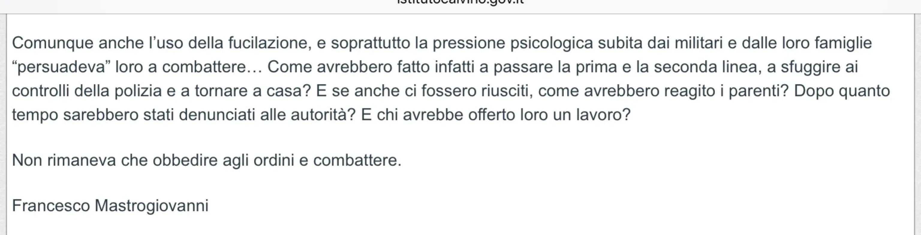 Questa situazione accomunava gli eserciti di entrambi gli schieramenti. Sicuramente la vera dispensatrice di morte e il vero terrore fu l'artiglieria, che con gli incessanti bombardamenti causò circa il 70% dei morti e dei feriti nel corso del conflitto. Prima di un attacco alle trincee nemiche, queste venivano martellate da bombardamenti lunghi ed incessanti. Ove non vi era l'effetto distruttivo di queste armi, vi era tuttavia il terrore, la confusione e lo stress provocati dalle continue deflagrazioni, che arrivavano a durare anche numerose giornate consecutive. L'obiettivo era quello di stordire e spaventare il nemico trincerato, così che non potesse reagire con determinazione all'imminente assalto. Assalto che era per i soldati il peggiore momento della guerra. Il preannuncio dell'attacco era di pochi minuti o al massimo di un paio d'ore, e proprio l'attesa era il momento più angosciante. Tutti i soldati sapevano che molti di loro sarebbero rimasti impigliati nel filo spinato e sarebbero diventati obiettivi ideali per i tiratori nemici, ma sopratutto erano consapevoli che era tutta la loro azione sarebbe stata inutile: anche se fossero riusciti a conquistare la prima linea, avrebbero ricevuto la controffensiva della seconda linea e sarebbero stati ricacciati indietro. Ovviamente per tutti questi motivi la resistenza nervosa dei soldati fu messa a dura prova: i più "duri" avevano singhiozzi convulsivi, tremori, conati di vomito, e prostrazioni, i più sensibili arrivavano addirittura alla ribellione, alla diserzione, alla follia e al suicidio. Comunque, quando veniva impartito un ordine, l'attacco veniva sferrato. Una forza che permetteva ai soldati di continuare a combattere nonostante tutto fu la solidarietà. Essi sapevano che erano tutti sulla stessa barca, nessuno escluso. Lo spirito di corpo e il cameratismo davano un senso di unione e di coesione ai soldati, che diventarono un'unica grande famiglia. Questo concetto è espresso bene della poesia Fratelli di Ungaretti del 1916. « Di che reggimento siete fratelli? Parola tremante nella notte Foglia appena nata Nell'aria spasimante involontaria rivolta dell'uomo presente alla suaComunque anche l'uso della fucilazione, e soprattutto la pressione psicologica subita dai militari e dalle loro famiglie "persuadeva" loro a combattere ... Come avrebbero fatto infatti a passare la prima e la seconda linea, a sfuggire ai controlli della polizia e a tornare a casa? E se anche ci fossero riusciti, come avrebbero reagito i parenti? Dopo quanto tempo sarebbero stati denunciati alle autorità? E chi avrebbe offerto loro un lavoro? Non rimaneva che obbedire agli ordini e combattere. Francesco Mastrogiovanni