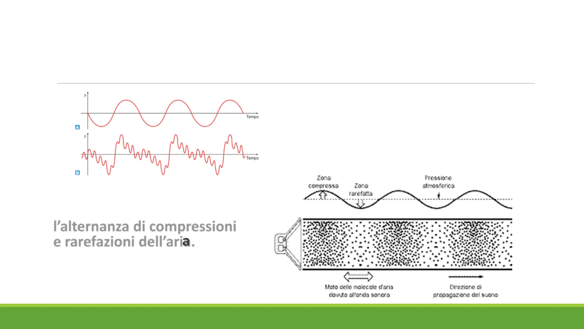 Tempo A y Tempo B Il suono si propaga mediante l'alternanza di compressioni e rarefazioni dell'aria. Non c'è trasporto di materia. Suono puro Suono complesso Zona compressa 37 Pressione atmosferica Zona rarefatta 1 Mato delle molecole d'aria dovuto all'onda sonora Direzione di propagazione del suonoULTRASUONI INFRASUONI