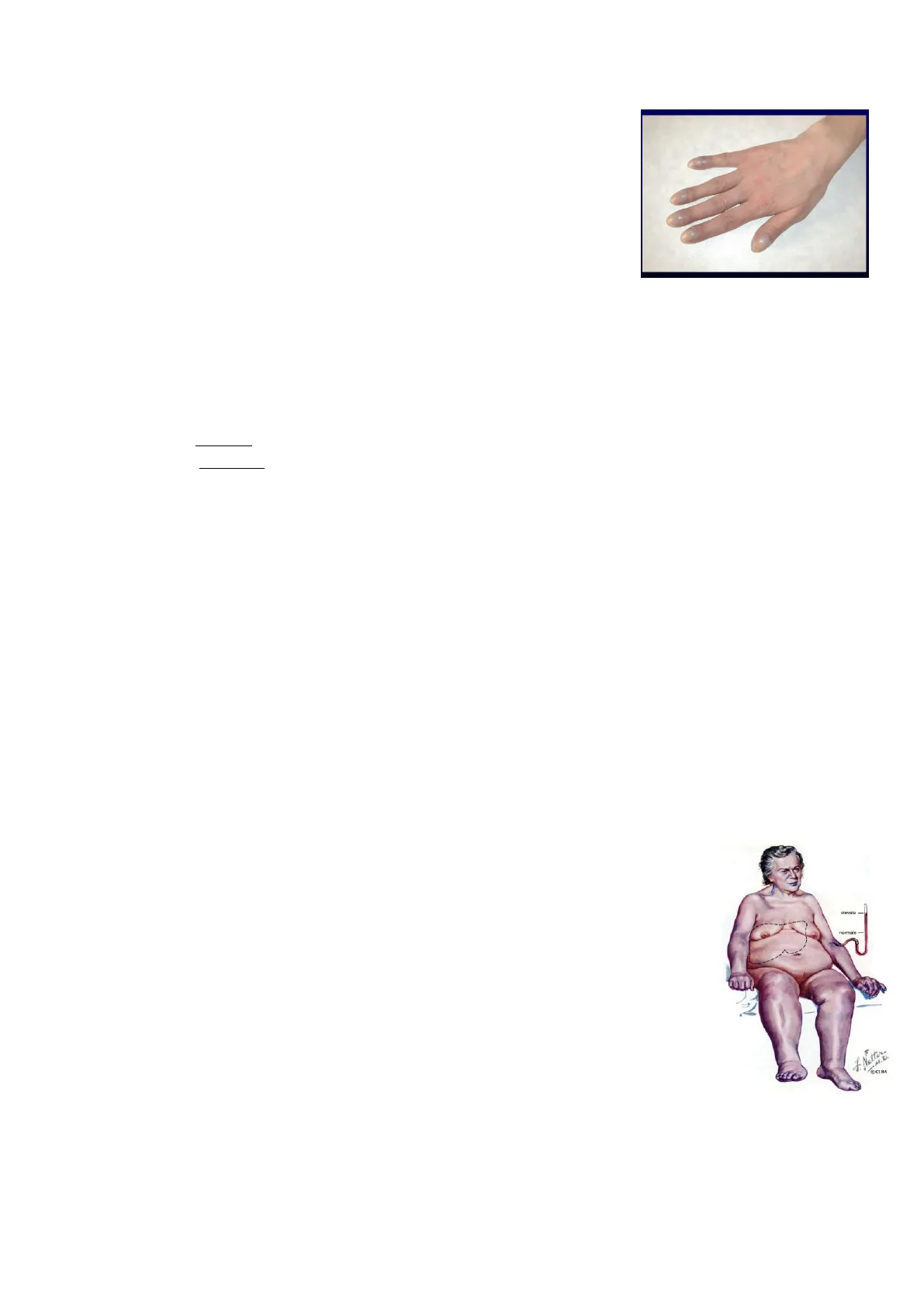 Nell'immagine possiamo vedere bene quanto possono differire le colorazioni della cute, soprattutto a livello palmare o plantare, tra un soggetto con livelli di emoglobina normali nel sangue e un soggetto anemico. Più biancastre nel soggetto anemico. A livello delle estremità, in ambito cardiologico, un indizio che deve farci pensare a cardiopatie congenite, in particolare cardiopatie che determinano degli shunt 1(passaggi di sangue tra il versante venoso e quello arterioso) è l'ippocratismo digitale. Si possono osservare delle estremità ungueali sollevate, unghie molto particolari, anche chiamate a vetrino d'orologio per la tipica forma bombata. Questo tipo di manifestazione clinica è molto comune in cardiopatie congenite che determinano la comparsa di shunt tra le sezioni destre e le sinistre del cuore; queste manifestazioni, dal punto di fisiopatologico, sono legate alla deposizione di tessuto connettivale subungueale che diventa tanto più marcato quanto più è grave la cardiopatia. Solitamente questo segno si accompagna sempre al rilievo di saturazioni di ossigeno ben inferiori alla media. A questo, talvolta si accompagna un colorito bluastro della cute, detto anche cianosi, condizione che si associa ad una situazione di ipossiemia. La situazione cianotica inizia a comparire quando abbiamo delle concentrazioni di emoglobina non ossigenata maggiori di 5 g/dL e a seconda di dove la cianosi è localizzata distinguiamo forme di: