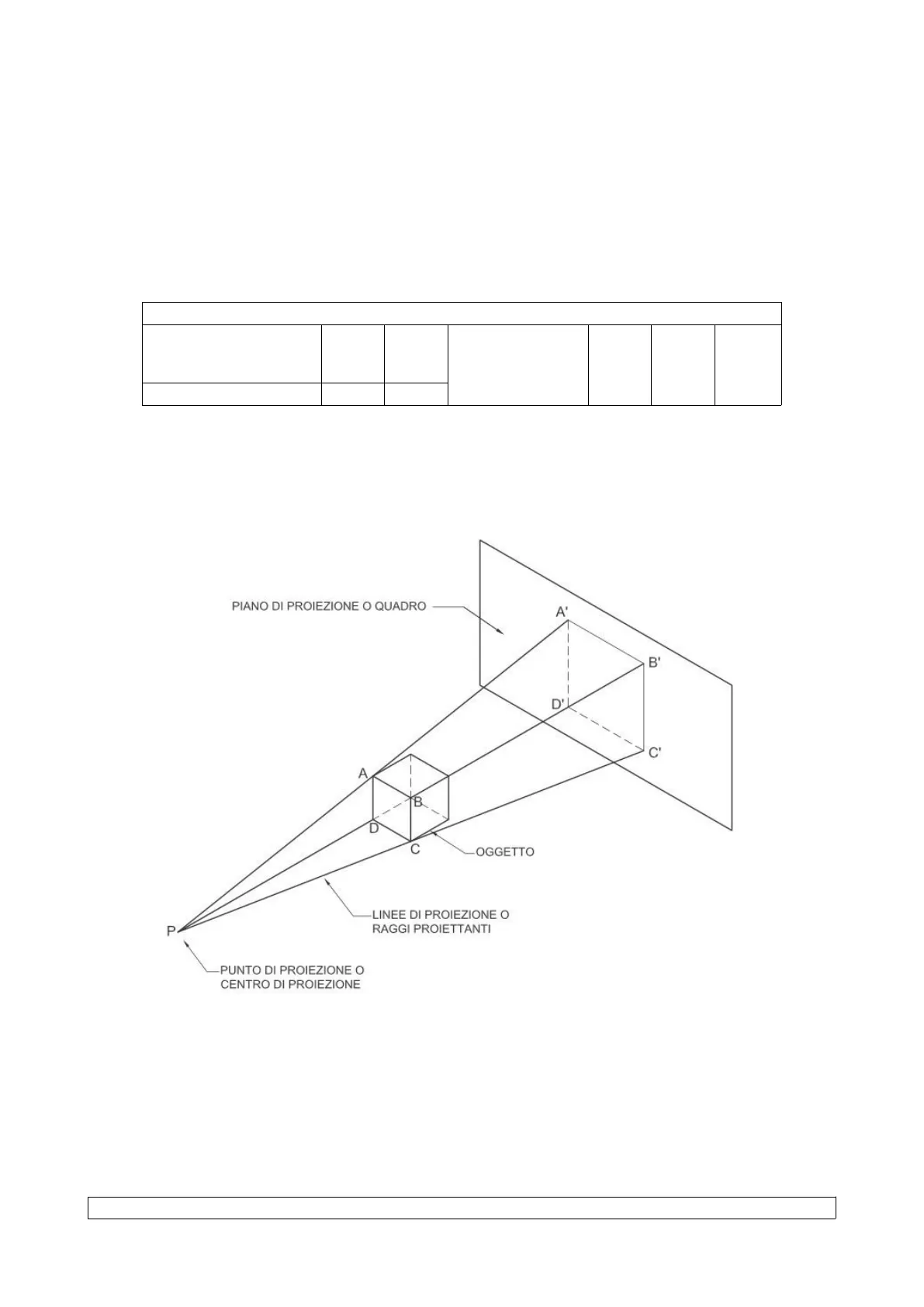 Lezione del 16/09/2024: poiché gli oggetti che vengono rappresentati sono dei solidi per poterli rappresentare in un piano (foglio di carta) si ricorre a tecniche di rappresentazione grafica basate sul concetto di "proiezione" dove il solido viene proiettato su di un piano grazie a delle linee di proiezione uscenti da un centro di proiezione.