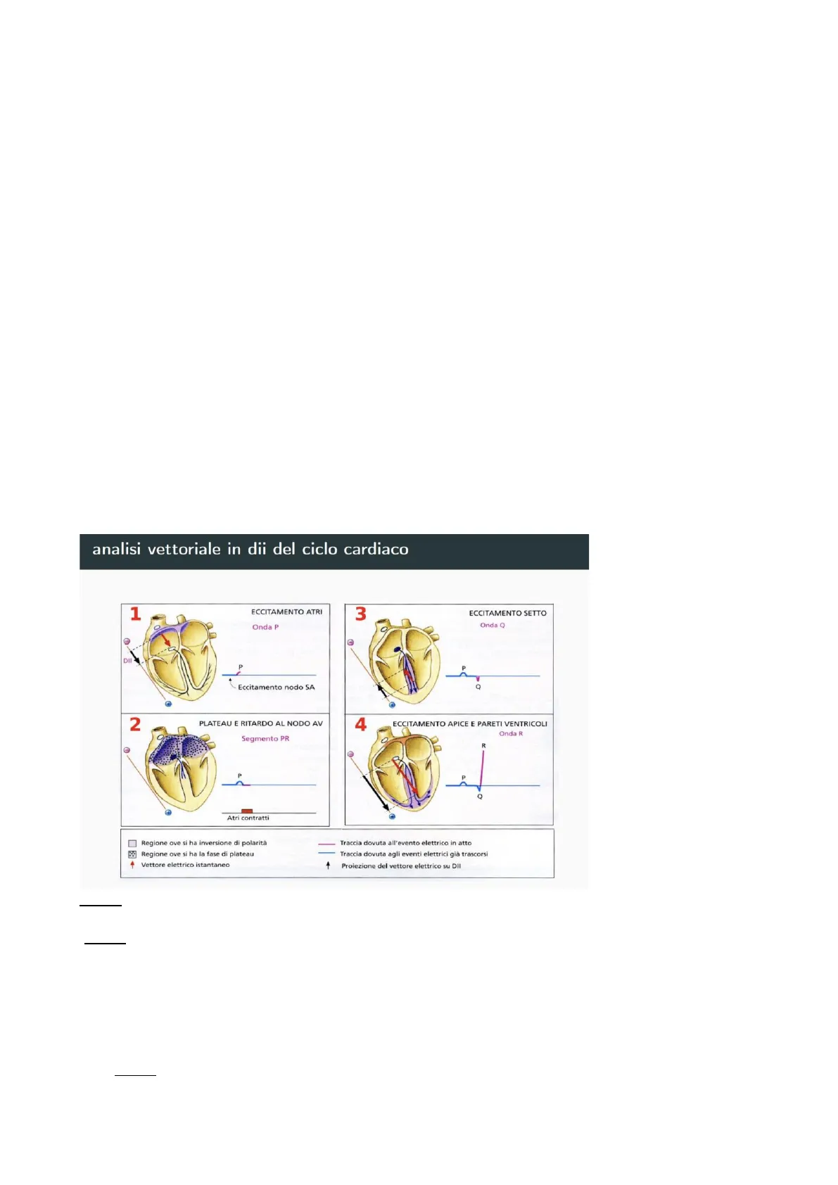 1 ECCITAMENTO ATRI 3 ECCITAMENTO SETTO Onda Q Onda P e P Eccitamento nodo SA Q 2 PLATEAU E RITARDO AL NODO AV 4 ECCITAMENTO APICE E PARETI VENTRICOLI Onda R Segmento PR e O Atri contratti Regione ove si ha inversione di polarità Traccia dovuta all'evento elettrico in atto Regione ove si ha la fase di plateau Traccia dovuta agli eventi elettrici già trascorsi Vettore elettrico istantaneo + Proiezione del vettore elettrico su DII R FASE 1: Nella prima parte abbiamo la depolarizzazione che si sta propagando dal nodo SA ed è rappresentata dall'onda P. Nel momento in cui entrambe le camere atriali si depolarizzano raggiungiamo la fase di plateau (FASE 2). Le porzioni rosse rappresentano le porzioni atriali in cui si genera tensione contrattile che manifesta indipendenza da fasi di plateau (cioè, da una persistenza di una concentrazione di calcio che viene mantenuta a livelli sufficienti per innescare meccanismo troponina-tropomiosina). Nella muscolatura cardiaca (dove il calcio arriva dal reticolo sarcoplasmatico o dallo spazio extracellulare) l'attività e la depolarizzazione sostenuta dai livelli di Ca fa sì che la concentrazione si mantenga elevata per favorire meccanismo contrattile. La propagazione attiva di cariche genera una variazione di dipolo lungo l'asse elettrico cardiaco avremo successivamente un segmento PQ che corrisponde alla completa depolarizzazione degli atri (sistole atriale). Nella FASE 3 l'onda di depolarizzazione attraversa il nodo AV e abbiamo un attivazione del fascio di His perché assistiamo ad una variazione di dipolo transitoria che consente di visualizzare il vettore del dipolo e di 2Gozzi, Govoni, Govi FISIOLOGIA III (Mapelli) Lezione 6, 18/03/2024 definirlo con una cinetica negativa, rappresentata da una variazione del potenziale di membrana da valore positivo a negativo in un tempo molto rapido. FASE 4: depolarizzazione delle fibre del Purkinje, in cui le cariche elettriche inondano anche le pareti dei ventricoli. Si genera onda positiva rapida.