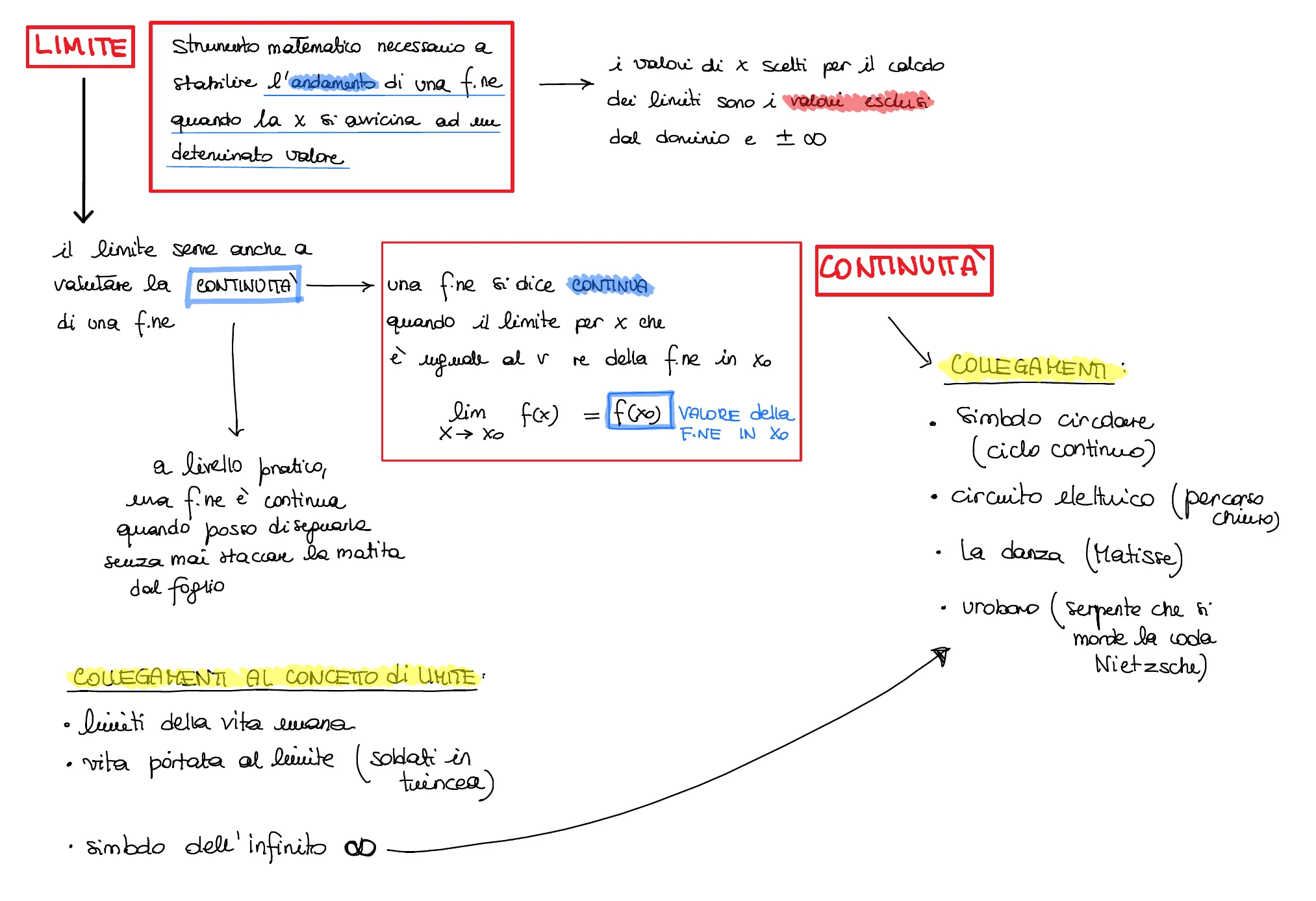 Strumento matematico necessario a stabilire l'andamento di una fine quando la x si avvicina ad un determinato valore i valori di x scelti per il calcolo dei limiti sono i valori esclusi dal dominio e + 00 il limite serve anche a valutare la CONTINUITÀ di una fine > una fine si dice CONTINUA quando il limite per x che è uguale al v re della fine in xo lim f(x) = f(x) X> Xo VALORE della FINE IN XO a livello pratico, una fine è continua quando posso di seguarla senza mai staccare la matita dal foglio