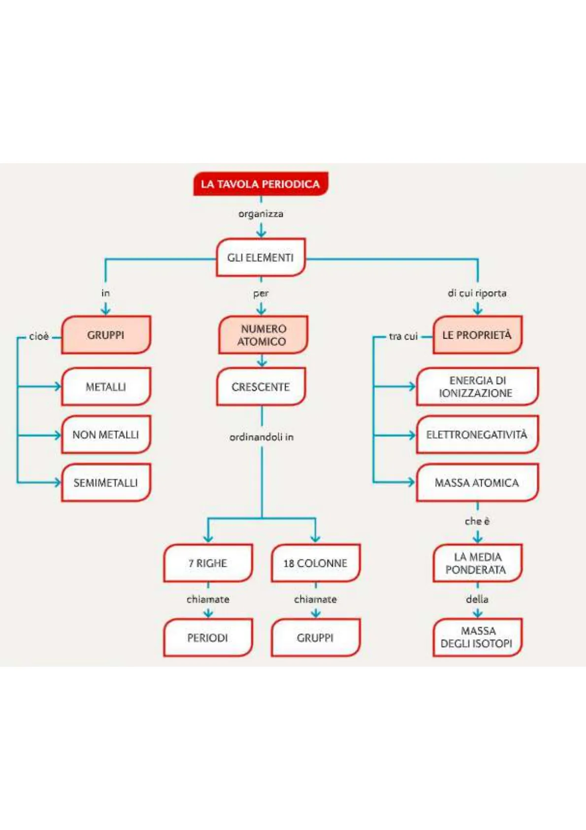 LA TAVOLA PERIODICA organizza GLI ELEMENTI in per di cui riporta cioè - GRUPPI NUMERO ATOMICO tra cui LE PROPRIETÀ METALLI CRESCENTE ENERGIA DI IONIZZAZIONE NON METALLI ordinandoli in ELETTRONEGATIVITÀ SEMIMETALLI MASSA ATOMICA che è 7 RIGHE 18 COLONNE LA MEDIA PONDERATA chiamate chiamate della > PERIODI GRUPPI MASSA DEGLI ISOTOPI
