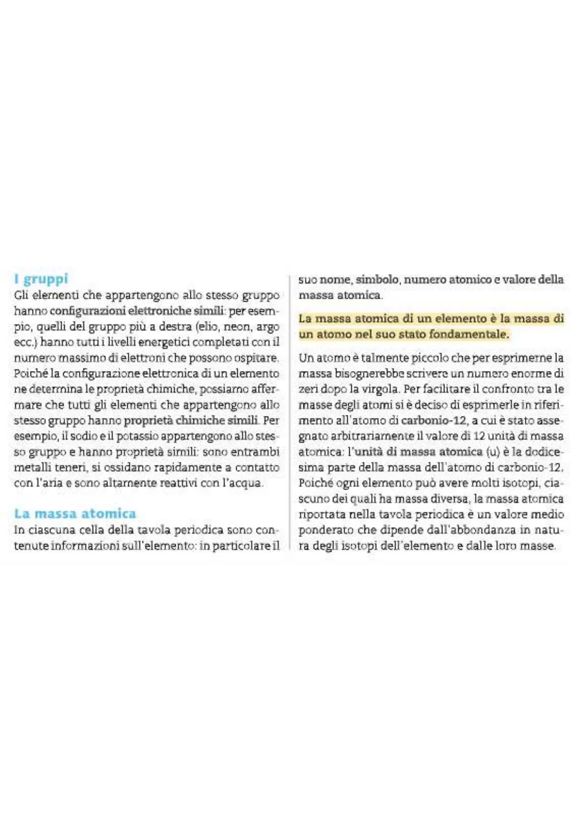 Poiché ogni elemento può avere molti isotopi, cia scuno dei quali ha massa diversa, la massa atomica riportata nella tavola periodica è un valore medio ponderato che dipende dall'abbondanza in natu- ra degli isotopi dell'elemento e dalle loro masse.