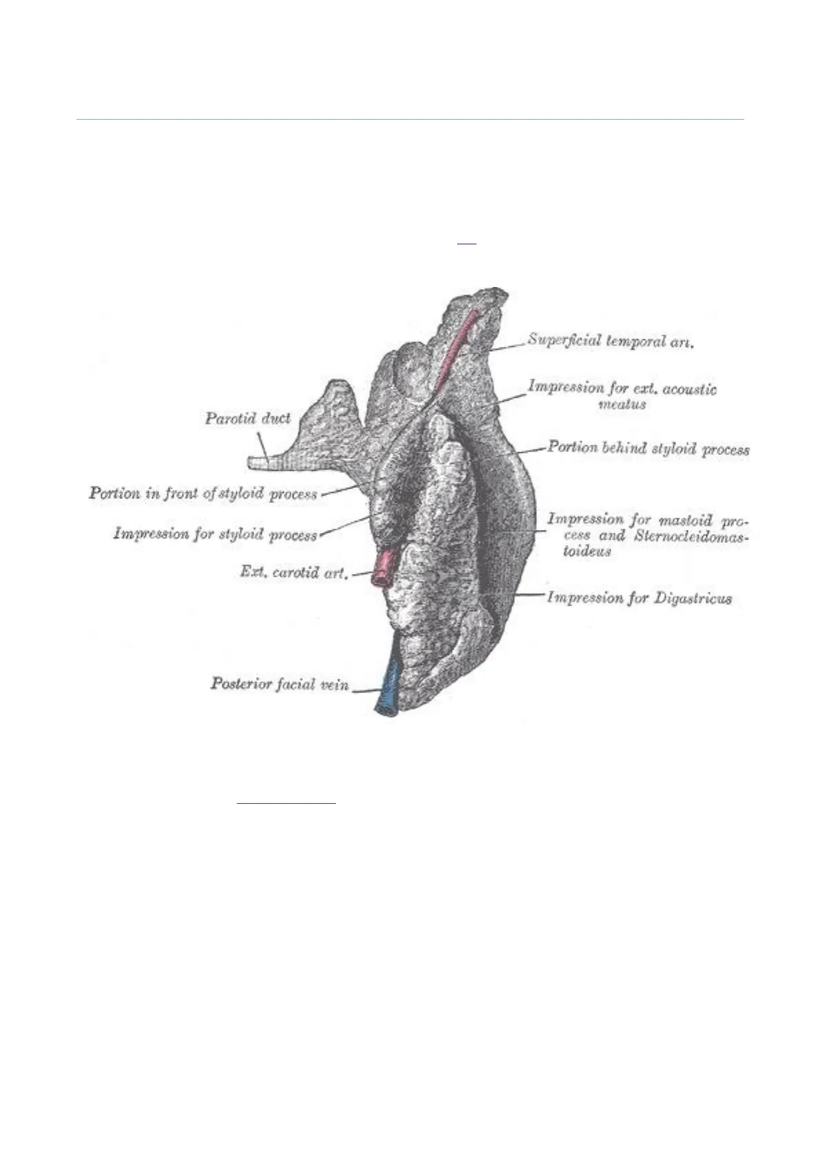 Le ghiandole parotidi possono essere palpate anteriormente e inferiormente alla metà inferiore dell'orecchio sulla superficie laterale della guancia. Si estendono inferiormente al bordo inferiore della mandibola e superiormente all'arco zigomatico. Ogni ghiandola parotide comprende un lobo superficiale e un lobo profondo divisi dal nervo facciale e dalla vena facciale posteriore. Tra i lobi della ghiandola, c'è anche tessuto adiposo che facilita i movimenti mandibolari. Il lobo superficiale si trova lateralmente al nervo facciale e ricopre la superficie laterale del muscolo masseterino. Illobo profondo si trova medialmente al nervo facciale ed è situato tra il processo mastoideo dell'osso temporale e il ramo mandibolare. Una capsula fasciale chiamata guaina parotide circonda le ghiandole parotidi. [1]