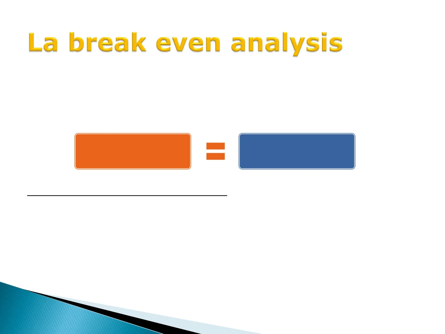 La break even analysis (o analisi del punto di pareggio o di equilibrio) è uno strumento di controllo con il quale si determina il volume di produzione che consente di ottenere il pareggio tra ricavi totali e costi totali.