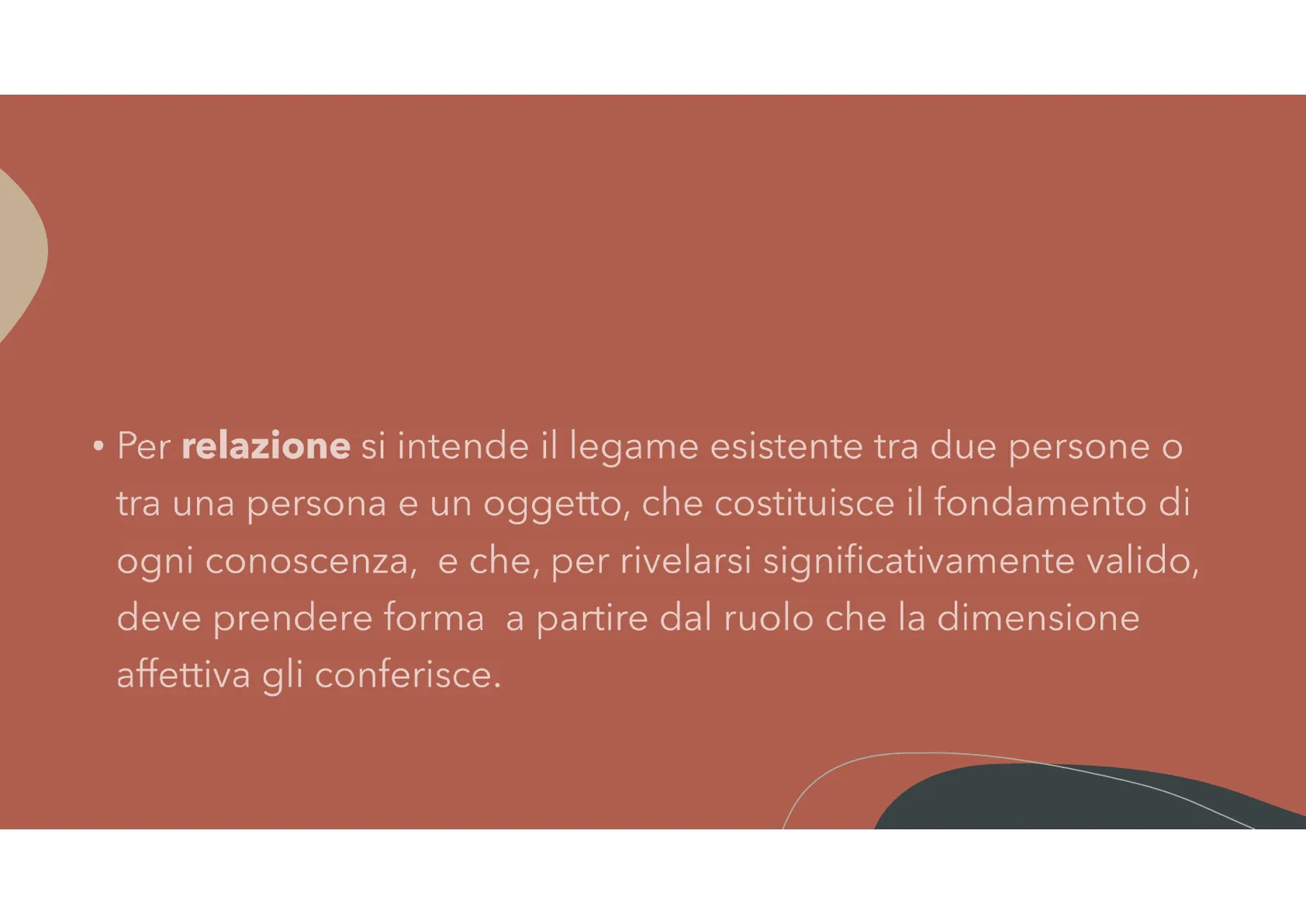 Slide da Università su La relazione educativa. Il Pdf esplora il concetto di relazione umana, sottolineando il riconoscimento dell'"Altro da Sé" e il "porsi in distanza" come condizioni per legami significativi. Questo documento di Psicologia è adatto per il grado universitario.