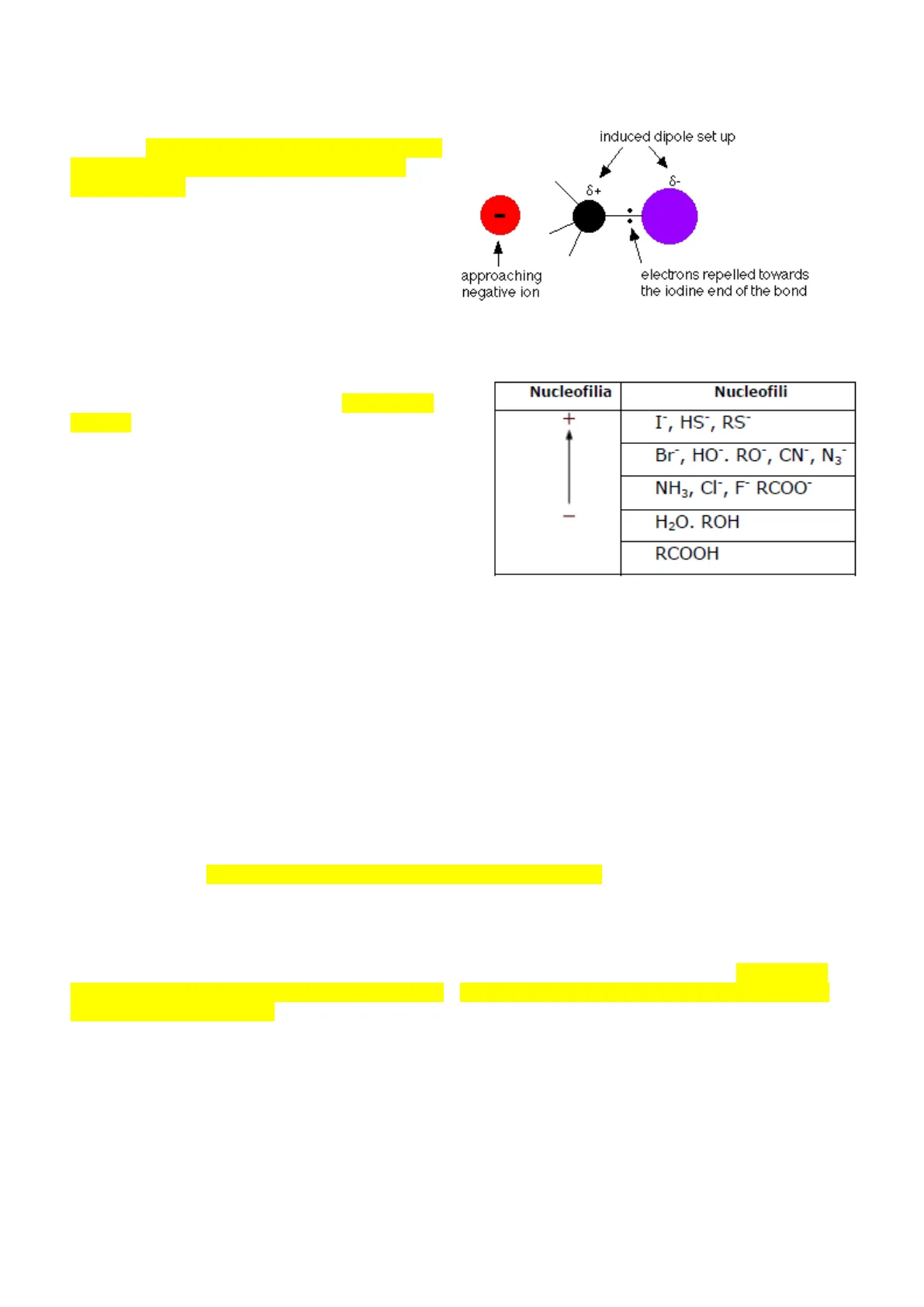 Le specie nucleofile sono normalmente più elettronegative dell'atomo di carbonio; per questo motivo l'atomo di carbonio legato al gruppo uscente assume una parziale carica positiva, quindi ha caratteristiche elettrofile e costituisce un buon punto di attacco per il nucleofilo entrante. I substrati che più comunemente sono coinvolti nelle reazioni di sostituzione nucleofila sono gli alogenuri alchilici, in quanto gli alogeni (in particolare cloro, bromo e iodio, non il fluoro per ragioni che vedremo più avanti) sono buoni gruppi uscenti. I reattivi nucleofili che possono fungere da gruppi entranti sono invece molti. Possono essere ioni negativi o specie neutre. Le tabelle in fondo a pagina 136 del vostro libro di testo e quella qui a fianco ne riportano alcuni.