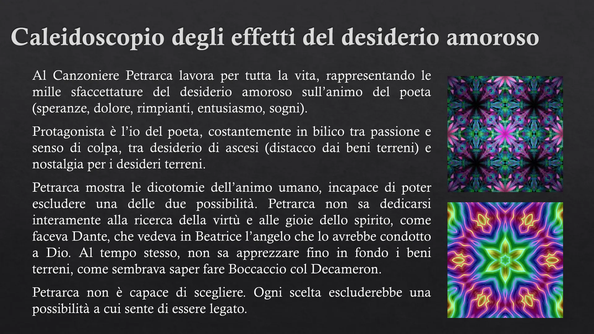 Petrarca mostra le dicotomie dell'animo umano, incapace di poter escludere una delle due possibilità. Petrarca non sa dedicarsi interamente alla ricerca della virtù e alle gioie dello spirito, come faceva Dante, che vedeva in Beatrice l'angelo che lo avrebbe condotto a Dio. Al tempo stesso, non sa apprezzare fino in fondo i beni terreni, come sembrava saper fare Boccaccio col Decameron.
