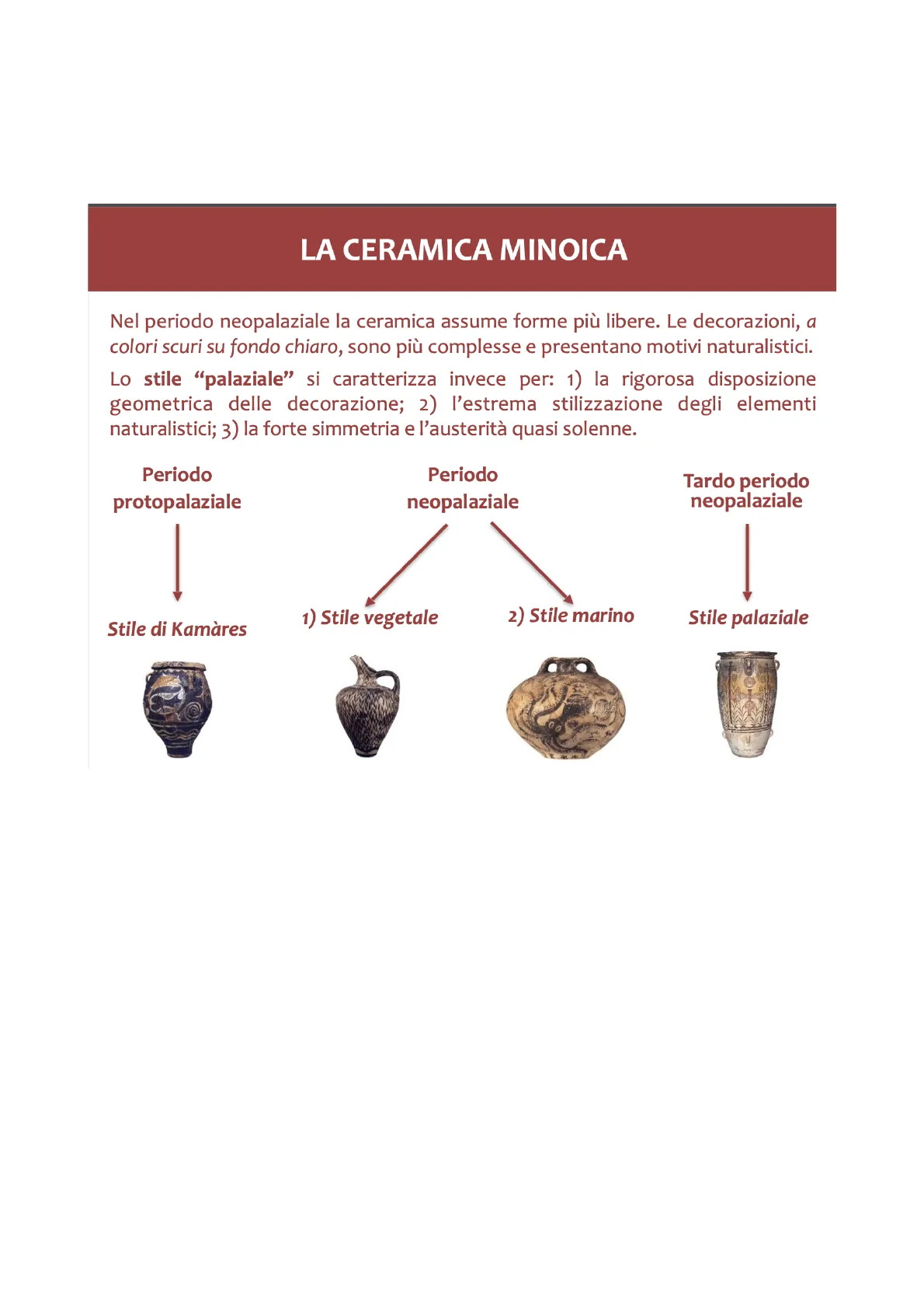 Nel periodo neopalaziale la ceramica assume forme più libere. Le decorazioni, a colori scuri su fondo chiaro, sono più complesse e presentano motivi naturalistici. Lo stile "palaziale" si caratterizza invece per: 1) la rigorosa disposizione geometrica delle decorazione; 2) l'estrema stilizzazione degli elementi naturalistici; 3) la forte simmetria e l'austerità quasi solenne.