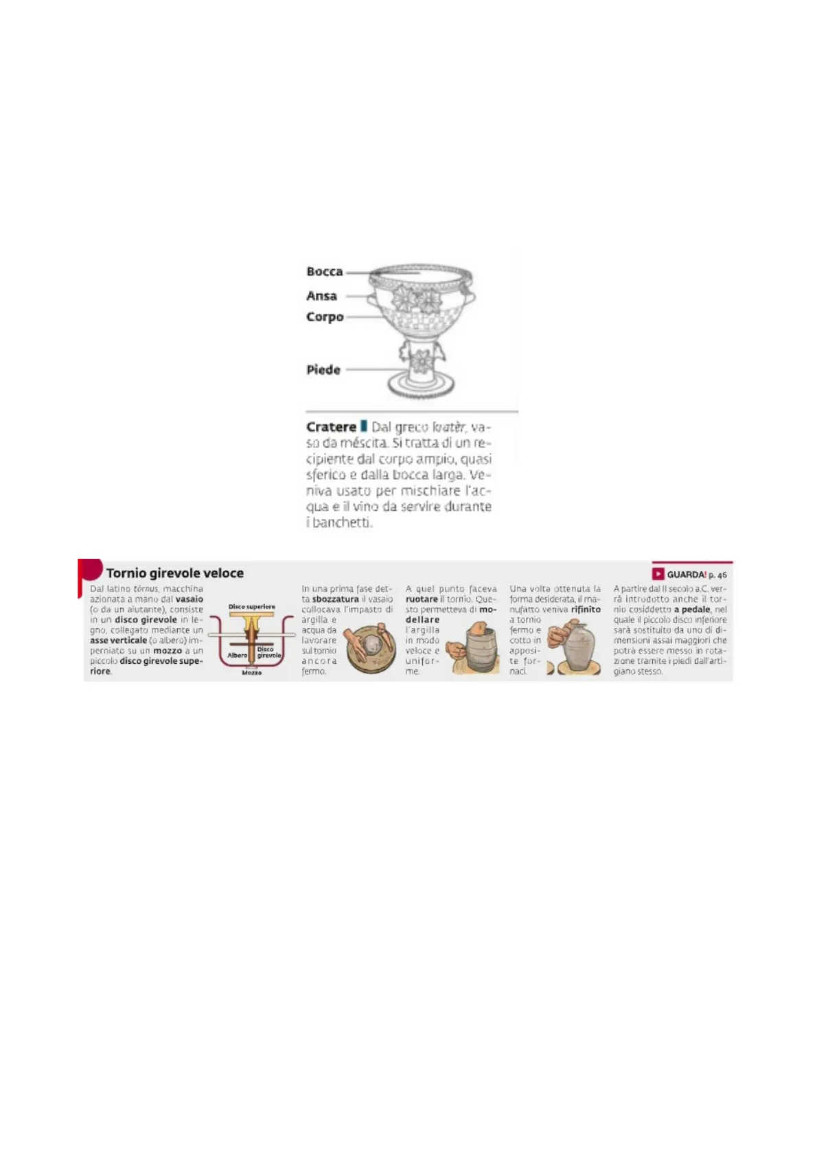 GUARDA! p. 46 Dal latino tornus, macchina azionata a mano dal vasaio (o da un aiutante), consiste in un disco girevole in le- gno, collegato mediante un asse verticale (o albero) im- perniato su un mozzo a un piccolo disco girevole supe- riore