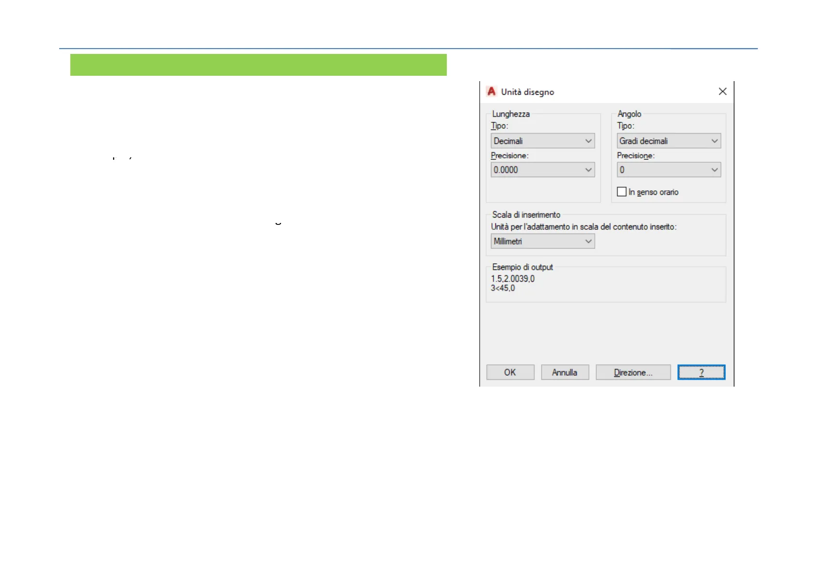 A Unità disegno X Lunghezza Angolo Tipo: Tipo: Decimali V Gradi decimali V Precisione: Precisione: 0.0000 V 0 V In senso orario Scala di inserimento Unità per l'adattamento in scala del contenuto inserito: Millimetri V Esempio di output 1.5,2.0039,0 3<45,0 OK Annulla Direzione ... ?