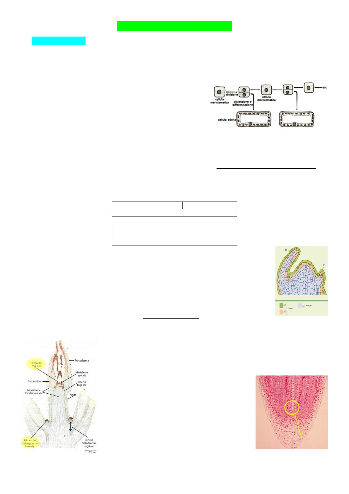 divisione cellula meristematica cellula meristematica distensione e differenziazione Le cellule meristematiche sono dotate di divisione asimmetrica: la cellula meristematica va incontro a divisione cellulare cellula adulta originando due cellule, una di queste continua a crescere raggiungendo le dimensioni della cellula madre e mantenendo la capacità di dividersi, rimanendo quindi meristematica; l'altra va incontro a differenziamento diventando una cellula adulta. In questo modo le cellule meristematiche si mantengono e alcune di esse si differenziano. Le cellule con queste caratteristiche sono chiamate cellule iniziali e consentono la crescita indeterminata della pianta. L'attività dei meristemi apicali determina la formazione dei meristemi primari, cioè popolazioni di cellule meristematiche che non sono però destinate a formare qualsiasi tipo cellulare ma sono predeterminate a formare dei tessuti: