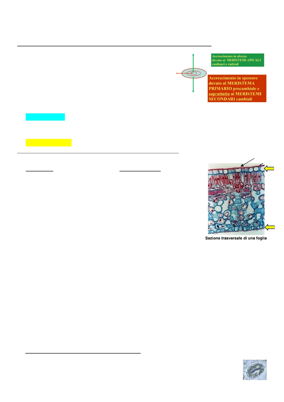 I. Epidermide -> Tessuto tegumentale primario esterno che avvolge e protegge le foglie e il corpo primario del fusto. L'epidermide è trasparente in quanto al di sotto è presente il tessuto fotosintetico. In alcuni casi l'epidermide è costituita da più strati cellulari, come nelle piante adattate a vivere in climi aridi (xerofite). Funzioni: - Protezione contro la perdita di acqua; - Protezione contro fattori abiotici o biotici; - Funzione di assorbimento di acqua e sali minerali cuticola Sezione trasversale di una foglia Spesso la cuticola è presente al di sopra dell'epidermide e, quando non è presente, la parete delle cellule epidermiche rivolte verso l'esterno è impregnata di sostanze idrofobe. L'epidermide di fusti e foglie spesso rivestita da tricomi (o peli) costituiti da cellule unicellulari o pluricellulari: alcuni hanno la capacità di riflettere la luce solare abbassando la temperatura della foglia e riducendo quindi la perdita di acqua come conseguenza della limitazione della traspirazione, mentre altri hanno funzione secretoria di sostanze chiamate oli eterei. Accanto ai tricomi secretori possiamo trovare le setole, cellule morte a maturità con una parete rigida e con funzione protettiva. L'attività meristematica di alcune cellule epidermiche puoi dar luogo alla formazione delle emergenze (es. aculeo di una rosa), delle protuberanze della regione corticale del fusto rivestite da epidermide costituita da cellule con parete suberificata. L'epidermide presenta anche gli stomi le cui cellule di guardia contengono i cloroplasti in quanto all'interno di essi avviene la fosforilazione ciclica per la produzione di ATP che viene utilizzato per far funzionare le pompe potassio e permettere l'apertura e chiusura degli stomi. Come si formano le cellule di guardia degli stomi? Le cellule delle foglie non hanno un accrescimento indefinito ma vanno incontro a distensione e differenziamento. Alcune cellule sono in grado di poter riattivare la divisione cellulare e dar luogo alla formazione di cellule che mantengono l'attività meristematica, queste cellule prendono il nome di meristemoidi, e dalla loro attività si formano gli stomi.