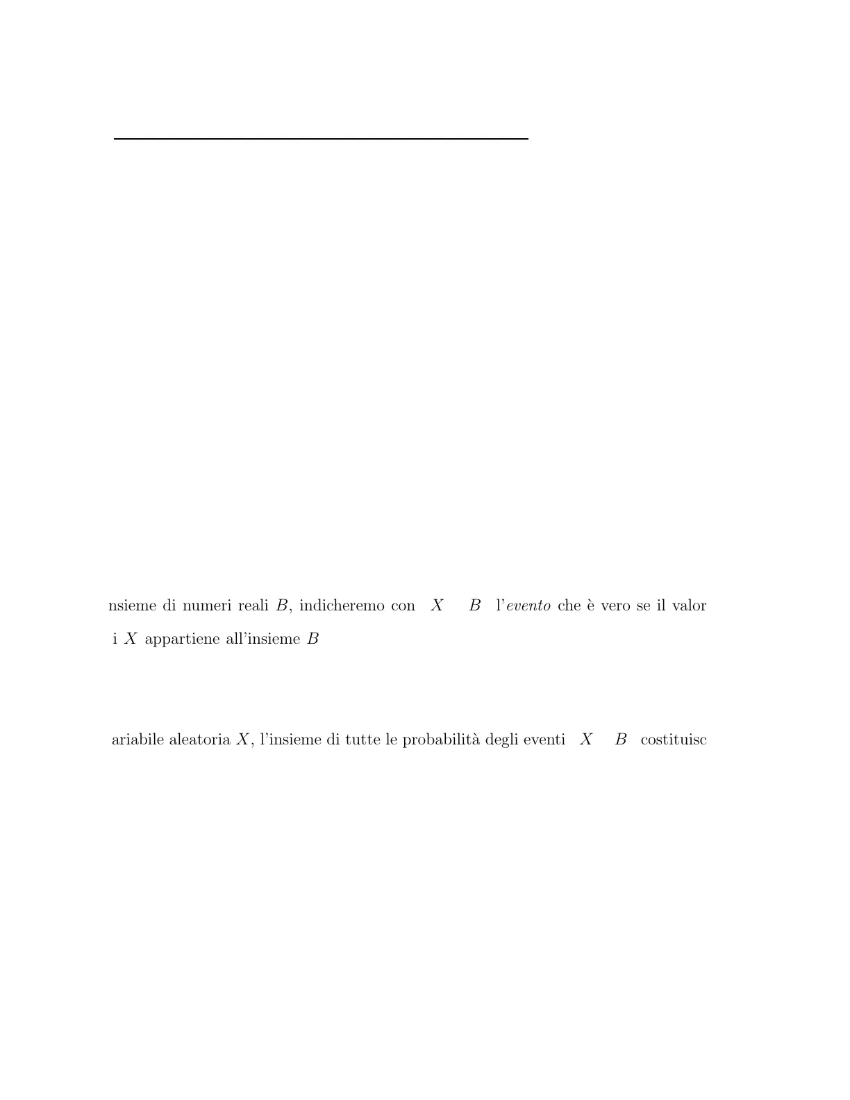 Introduciamo in questa sezione il concetto di variabile aleatoria, presentando dap- prima alcuni semplici esempi. Una scatola contiene 10 palline, 3 delle quali rosse e le restanti verdi. Supponiamo di estrarre dalla scatola, in successione e con reimmissione, 4 palline. Il numero X delle palline verdi estratte è aleatorio, ed i suoi valori possibili sono ovviamente gli elementi dell'insieme {0, 1,2,3,4}; a priori, però, non siamo in grado di dire quanto vale X, in quanto il suo valore dipende dall'esito dell'esperimento effettuato (le 4 estrazioni). Per questo motivo X è chiamata variabile aleatoria. Se, ad esempio, l'esito dell'esperimento è VVRV (cioè prime 2 palline e quarta pallina estratte verdi, terza pallina estratta rossa), X vale 3, stesso valore che assume se l'esito è una qualunque altra combinazione di 3 palline verdi ed una rossa, indipendentemente dall'ordine. Fissato un qualunque insieme di numeri reali B, indicheremo con {X E B} l'evento che è vero se il valore di X appartiene all'insieme B. Ad esempio, l'evento {X € {2,3}} è l'evento vero se il numero di palline verdi estratte è pari a 2 o a 3, così come l'evento {X > 2} è l'evento vero se il numero di palline verdi estratte è maggiore di 2. Considerata una variabile aleatoria X, l'insieme di tutte le probabilità degli eventi {X € B} costituisce la cosiddetta distribuzione di probabilità di X.