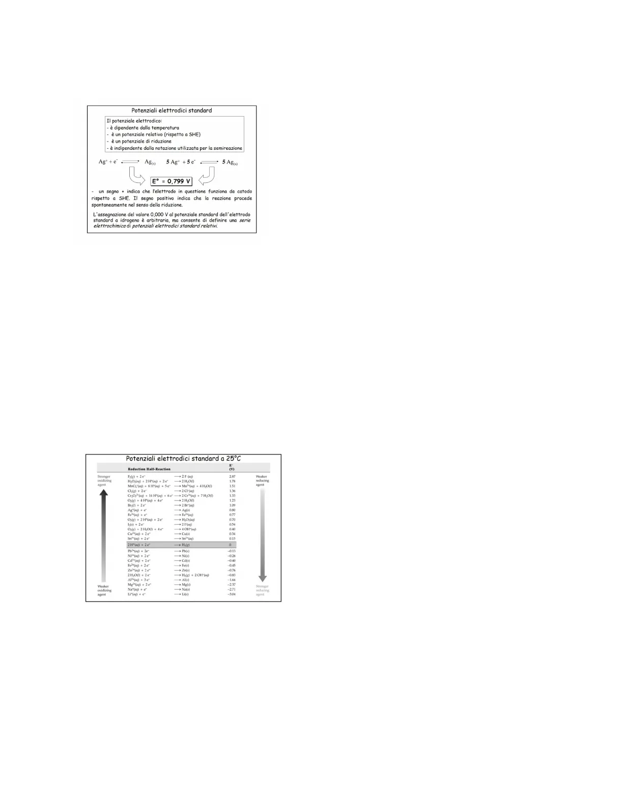 I potenziali elettrodici standard che si indicano con Eº sono dei potenziali presi sempre in una reazione di riduzione secondo la convezione IUPAC, e sono quelli le quali le attività di tutte le specie chimiche coinvolte nella redox sono unitarie. Questo significa che la pressione dei gas è uguale all'atmosfera per le soluzioni da concentrazione uno molare, e per i liquidi puri ed i soldi puri sono ad attività unitaria per definizione. I potenziali elettrodici sono dei potenziali che dipendono dalla temperatura, però noi possiamo calcolarci i potenziali anche a temperature diverse da quelle di riferimento che sono solitamente di 25° C. Il potenziale elettrodico standard Eº è un potenziale relativo perché è una differenza di potenziale che noi misuriamo rispetto all'elettrodo standard dell'idrogeno dato che per misurare la differenza di potenziale abbiamo bisogno di costruirci una cella elettrochimica nella quale la nostra coppia redox funga da catodo e l'elettrodo standard idrogeno funga da anodo. Siccome l'elettrodo standard a idrogeno può essere reversibile qualora il potenziale sia un potenziale negativo, vuol dire che la reazione che abbiamo pensato come riduzione non è spontanea, però è sempre una differenza di potenziale quella che noi andiamo a misurare perché poniamo arbitrariamente uguale a zero V il potenziale dell'elettrodo standard a idrogeno e non dipende questo potenziale dalla rotazione della reazione perché ad esempio in queste due semireazioni in cui c'è lo ione argento che si riduce acquistando un elettrone e forma argento metallico nelle semireazioni di sinistra, a destra c'è la stessa reazione però c'è un coefficiente 5 che moltiplica tutto. Il potenziale standard è sempre 0,799 volt quindi un valore positivo che significa che la reazione di riduzione rispetto all'elettrodo standard a idrogeno è una reazione spontanea. Il fatto di fare queste misure di differenze di potenziali in condizioni standard ci consente di stilare una scala di potenziale elettrodici standard che solitamente viene tabulata a 25 °℃ nella quale sono riportati i più importanti agenti ossidanti e riducenti. In questa tabella (presa da un testo americano, ma anche su quelli italiani è la stessa