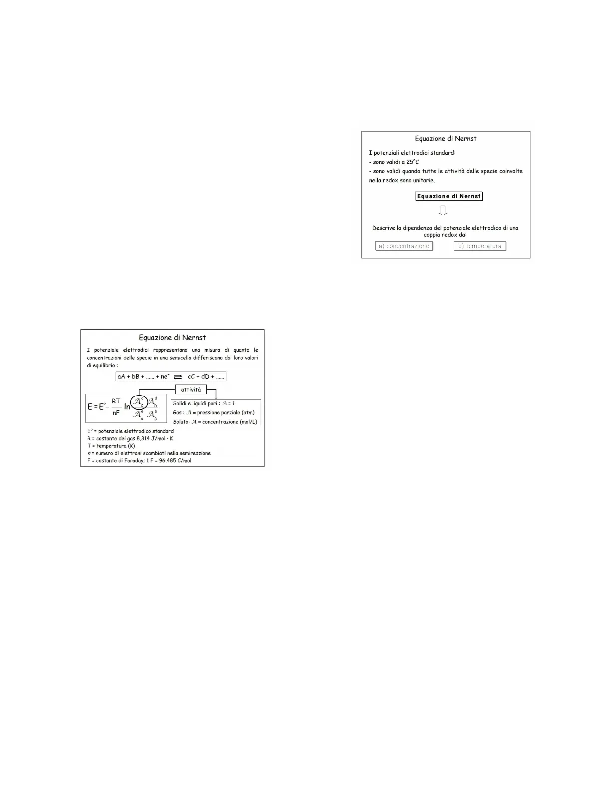 L'equazione di Nernst consente di calcolare il potenziale di una semicella (elettrodo), conoscendo il valore Eº, la temperatura e le attività della coppia redox.
