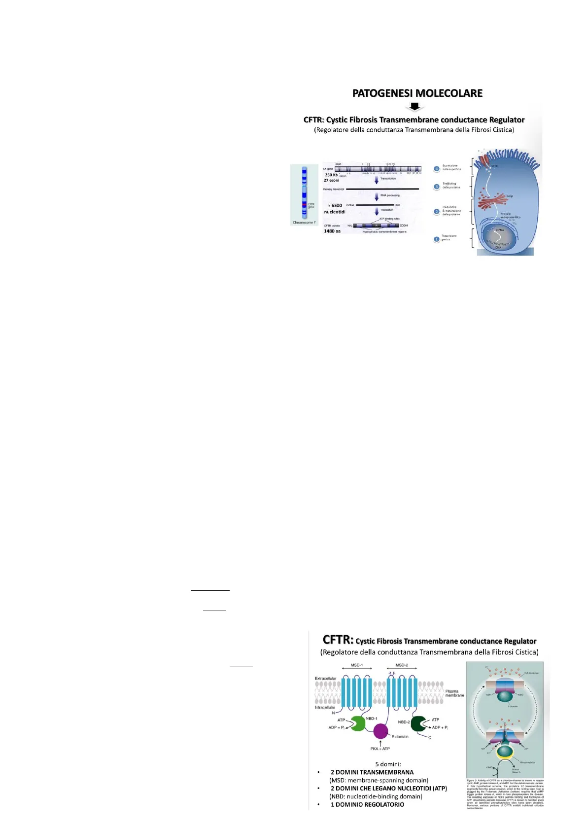 La patologia è caratterizzata da mutazioni del gene CFTR, che codifica per il canale CFTR, acronimo di Cystic Fibrosis Transmembrane Conductance ATF· Dominio regolatorio, situato nello spazio citoplasmatico. È importante per l'apertura del canale e contiene siti di fosforilazione (con serine e treonine) che vengono riconosciuti dalla PKA (proteina chinasi A) e coinvolgono anche il cAMP. Pertanto, una serie di fosforilazioni e il legame con l'ATP permettono che questo anello si stacchi dai domini trans-membrana, consentendo la fuoriuscita degli ioni Cl.