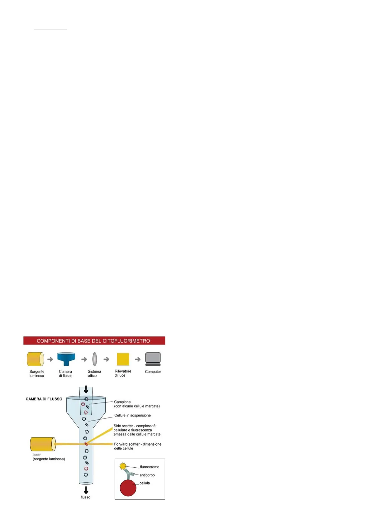 Citofluorimetria a flusso (utilizzata per l'emocromo ma anche per caratterizzare alcune neoplasie ematologiche) COMPONENTI DI BASE DEL CITOFLUORIMETRO 1 Sorgente luminosa Camera di flusso Sistema ottico Rilevatore di luce Computer CAMERA DI FLUSSO Campione (con alcune cellule marcate) Cellule in sospensione Side scatter - complessità cellulare e fluorescenza emessa dalle cellule marcate Forward scatter - dimensione delle cellule sione laser (sorgente luminosa) fluorocromo anticorpo cellula flusso
