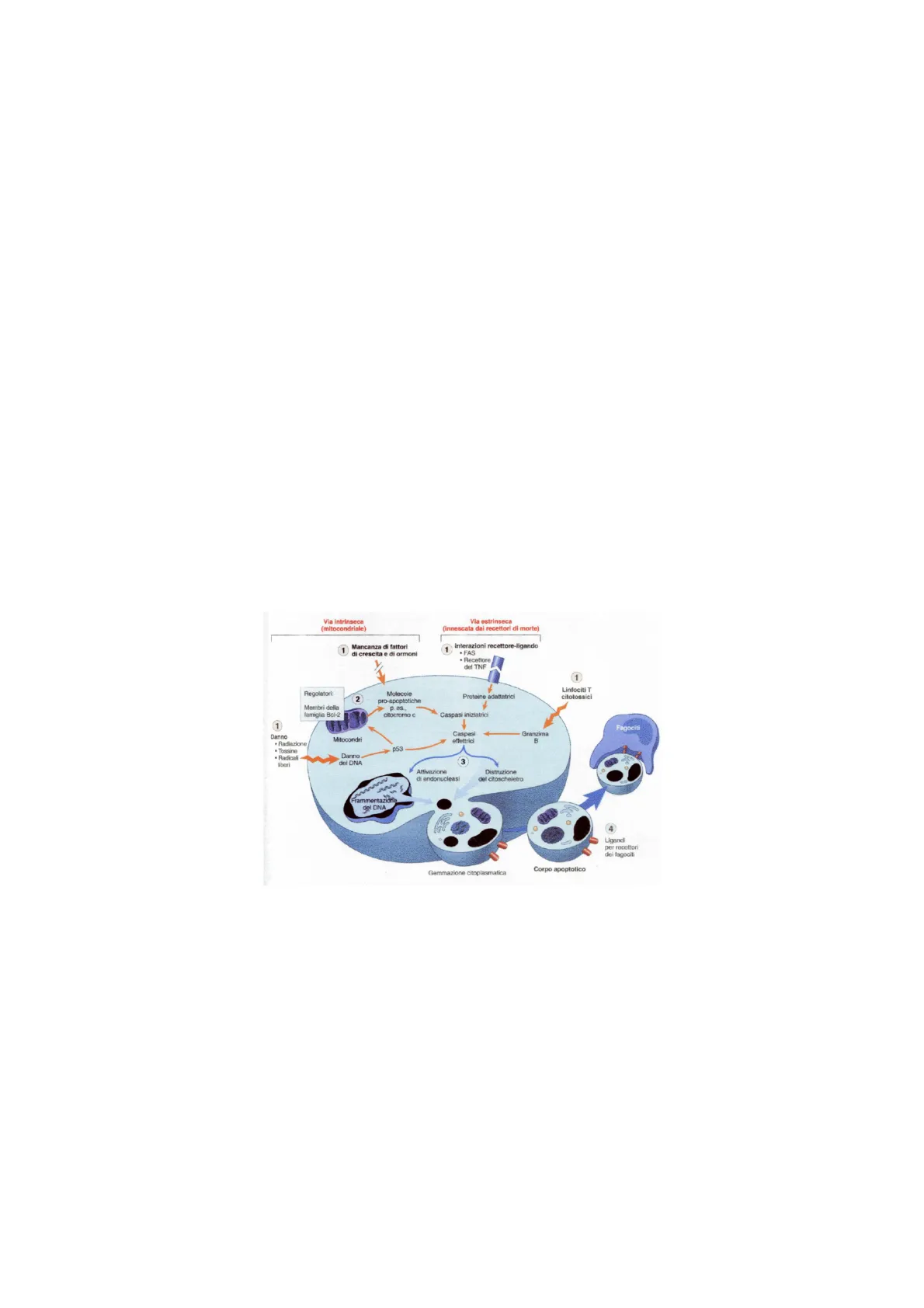 Via intrinseca (mitocondriale) Via estrinseca (innescata dai recettori di morte) Mancanza di fattori di crescita e di ormoni 1 Interazioni recettore-ligando . FAS · Recettore del TNF 1 Linfociti T citotossici Regolatori: 2 Molecole pro-apoptotiche p. es citocromo c Proteine adattatrici Membri della famiglia Bcl-2 Caspasi iniziatrici 1 Fagociti Danno Mitocondri Caspasi effettrici Granzima B · Radiazione · Tossine · Radicali liberi Danno del DNA 3 Attivazione di endonucleasi Distruzione del citoscheletro Frammentazione del DNA 4 Ligandi per recettori dei fagociti Gemmazione citoplasmatica Corpo apoptotico