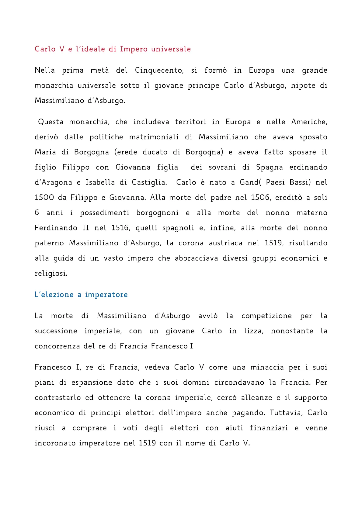 Nella prima metà del Cinquecento, si formò in Europa una grande monarchia universale sotto il giovane principe Carlo d'Asburgo, nipote di Massimiliano d'Asburgo. Questa monarchia, che includeva territori in Europa e nelle Americhe, derivo dalle politiche matrimoniali di Massimiliano che aveva sposato Maria di Borgogna (erede ducato di Borgogna) e aveva fatto sposare il figlio Filippo con Giovanna figlia dei sovrani di Spagna erdinando d'Aragona e Isabella di Castiglia. Carlo è nato a Gand( Paesi Bassi) nel 1500 da Filippo e Giovanna. Alla morte del padre nel 1506, ereditò a soli 6 anni i possedimenti borgognoni e alla morte del nonno materno Ferdinando II nel 1516, quelli spagnoli e, infine, alla morte del nonno paterno Massimiliano d'Asburgo, la corona austriaca nel 1519, risultando alla guida di un vasto impero che abbracciava diversi gruppi economici e religiosi.