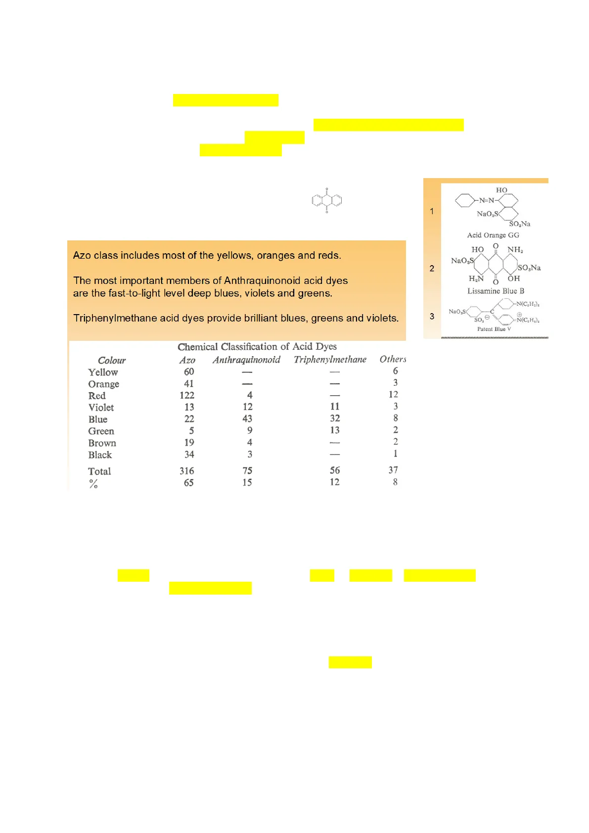 Azo class includes most of the yellows, oranges and reds. The most important members of Anthraquinonoid acid dyes are the fast-to-light level deep blues, violets and greens. Triphenylmethane acid dyes provide brilliant blues, greens and violets.