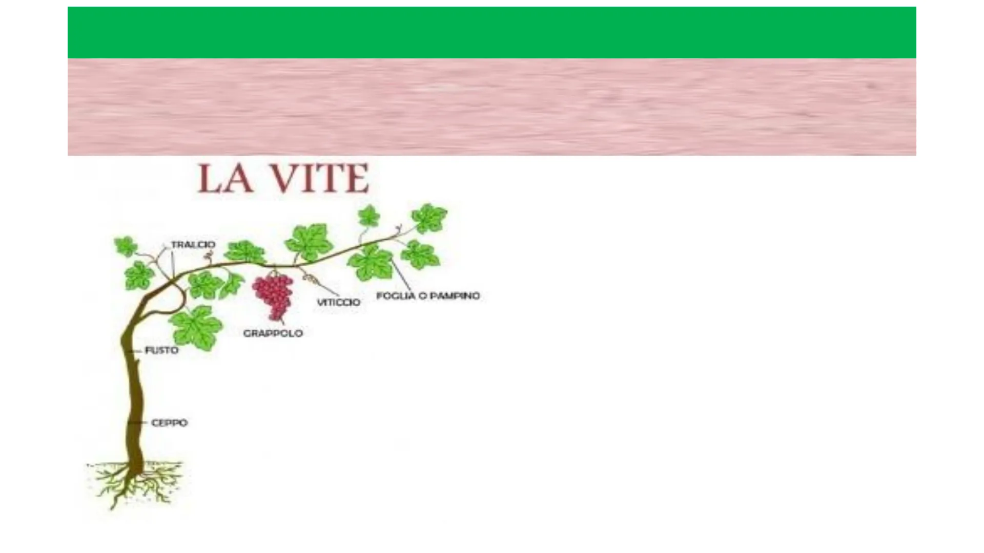 LA VITE TRALCIO FOGLIA O PAMPINO VITICCIO GRAPPOLO FUSTO -CEPPO La pianta della vite è costituita da un apparato radicale, da ceppo, fusto, tralci ed apparato fogliare.