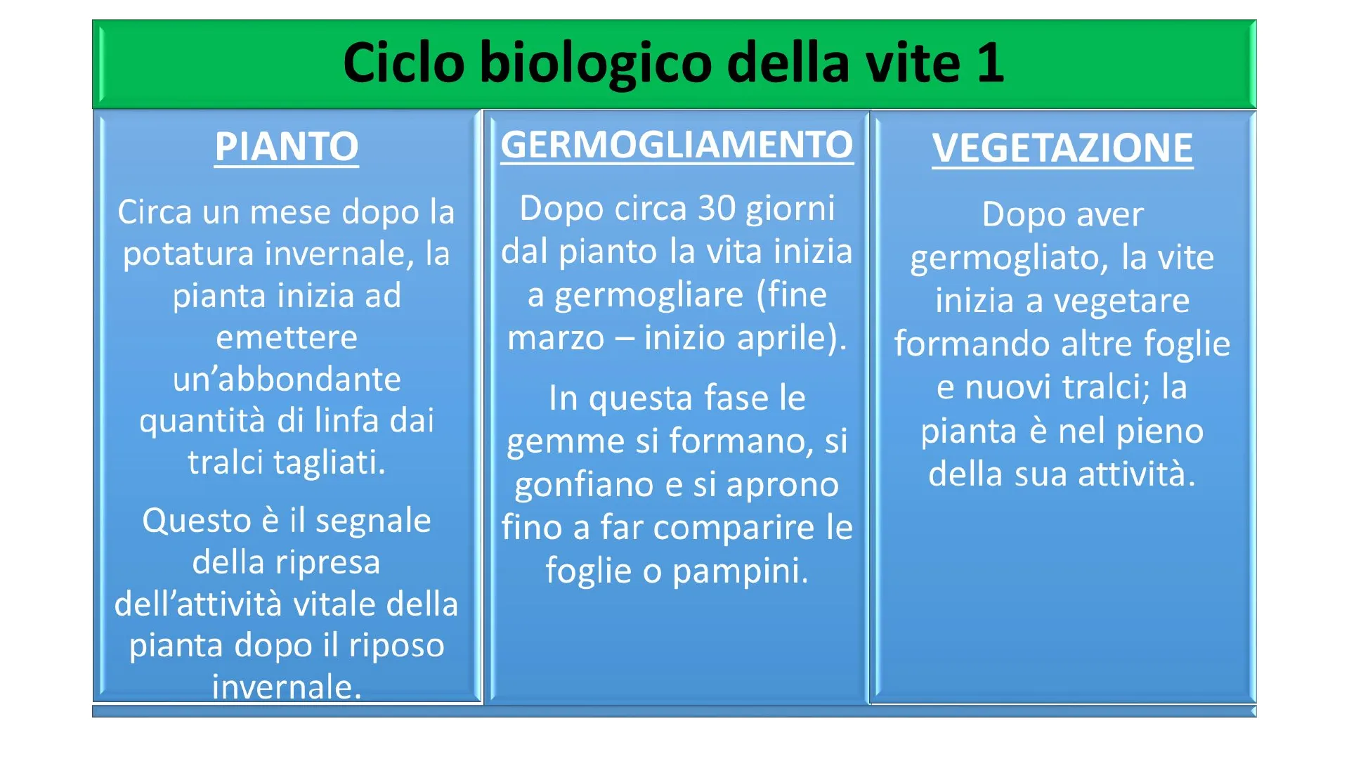 Dopo circa 30 giorni dal pianto la vita inizia a germogliare (fine marzo - inizio aprile). In questa fase le gemme si formano, si gonfiano e si aprono fino a far comparire le foglie o pampini.