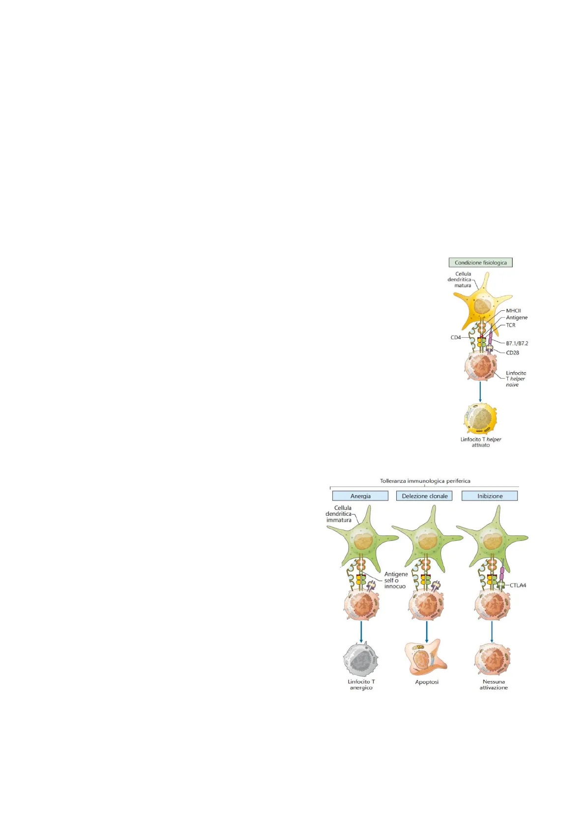 Anergia Delezione clonale Inibizione Cellula dendritica- immatura Antigene self o innocuo -CTLA4 Linfocito T anergico Apoptosi Nessuna attivazione