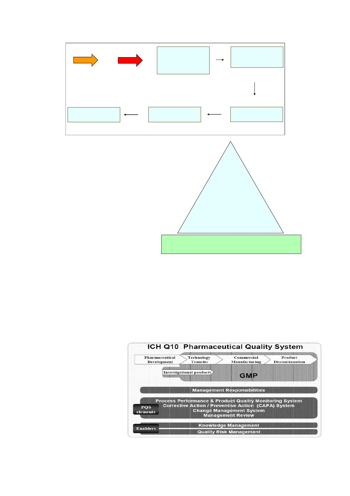 La ICH Q10 richiama il ruolo chiave del TT per il suo porsi tra lo Sviluppo Farmaceutico (dove si crea la conoscenza) o tra il Sito Donor (che già produce in una situazione di controllo) e, passando attraverso la convalida di processo, la produzione per il mercato presso il Sito Ricevente (che deve realizzarsi in una situazione di controllo). In questa linea guida, il TT viene citato all'interno del PQS (Pharmaceutical Quality System). Il PQS copre ICH Q10 Pharmaceutical Quality System l'intero lifecycle di un prodotto, includendo lo sviluppo Pharmaceutical Product Discontinuation Development Technology Transfer Commercial Manufacturing farmaceutico, il technology transfer, la produzione GMP Investigational products commerciale e la sospensione del prodotto. Il PQS incrementa le GMP regionali Management Responsibilities come mostrato nel diagramma, che Process Performance & Product Quality Monitoring System Change Management System Management Review Corrective Action / Preventive Action (CAPA) System mostra anche che le GMP POS elements regionali si applicano alla produzione degli IMPs.