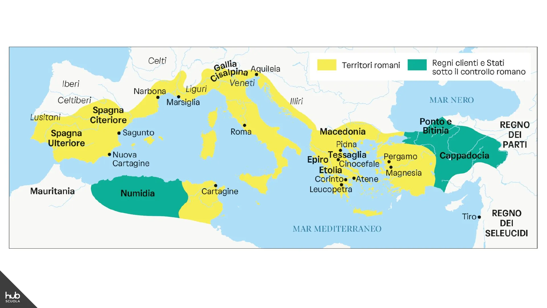 Gallia cisalpina Territori romani Regni clienti e Stati sotto il controllo romano Iberi Veneti Narbona Liguri Marsiglia Illiri MAR NERO Lusitani Spagna Citeriore Ponto e Bitinia REGNO DEI PARTI Pidna Cappadocia Epiro Tessaglia Cinocefale Etolia Magnesia Corinto· · Atene Leucopetra Mauritania Numidia Cartagine Tiro REGNO DEI SELEUCIDI MAR MEDITERRANEO