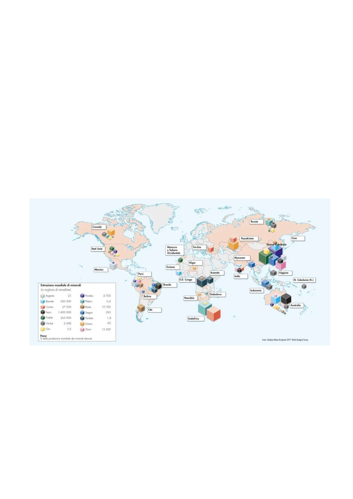 Canada Kazakistan Cina Nuova Caledonia Turchia Stati Uniti Marocco e Sahara Occidentale Myanmar Niger Guinea Messico Ruanda Filippine R.D. Congo N. Caledonia (Fr.) Estrazione mondiale di minerali (in migliaia di tonnellate) Argento 25 Piombo 4 700 Bolivia Namibia Bauxite 300 000 Platino 0,4 Cromo 37 500 Rome 19 700 Ferro' 2 400 000 Stagno 290 Fosfati 263 000 Tantalio 1,8 Nichel 2 098 Uranio 60 Oro: 3.2 Zinco 13 200 Poese % della produzione mondiale del minerali elencati Fonte: Calendario Adiante De Agostini 2019 - Betsh Geological Survey La durata Per rigenerarsi, le risorse minerarie impiegano milioni di anni. Sono quindi considerate risorsenon rinnovabili. Per questo, se il ritmo di estrazione e di sfruttamento di molti minerali non diminuirà, le loro riserve potrebbe esaurirsi. Perú India Brasile Indonesia Zimbabwe Australia Cile Sudafrica Russia