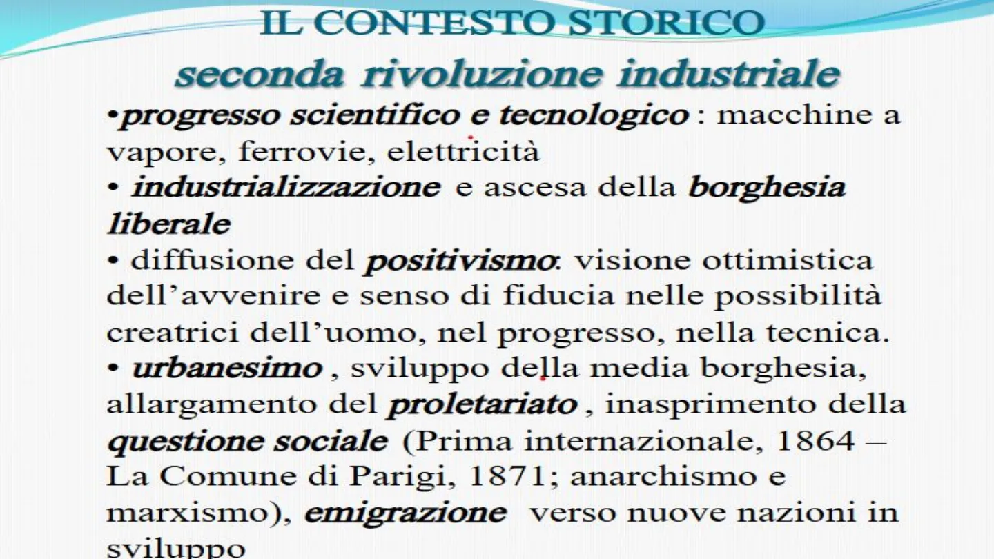seconda rivoluzione industriale ·progresso scientifico e tecnologico : macchine a vapore, ferrovie, elettricità · industrializzazione e ascesa della borghesia liberale · diffusione del positivismo. visione ottimistica dell'avvenire e senso di fiducia nelle possibilità creatrici dell'uomo, nel progresso, nella tecnica. · urbanesimo , sviluppo della media borghesia, allargamento del proletariato, inasprimento della questione sociale (Prima internazionale, 1864 - La Comune di Parigi, 1871; anarchismo e marxismo), emigrazione verso nuove nazioni in sviluppo