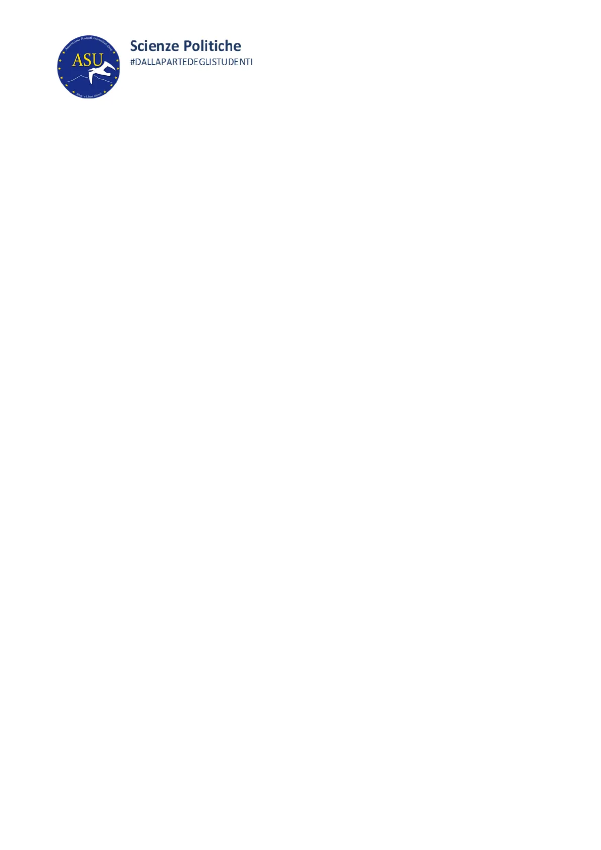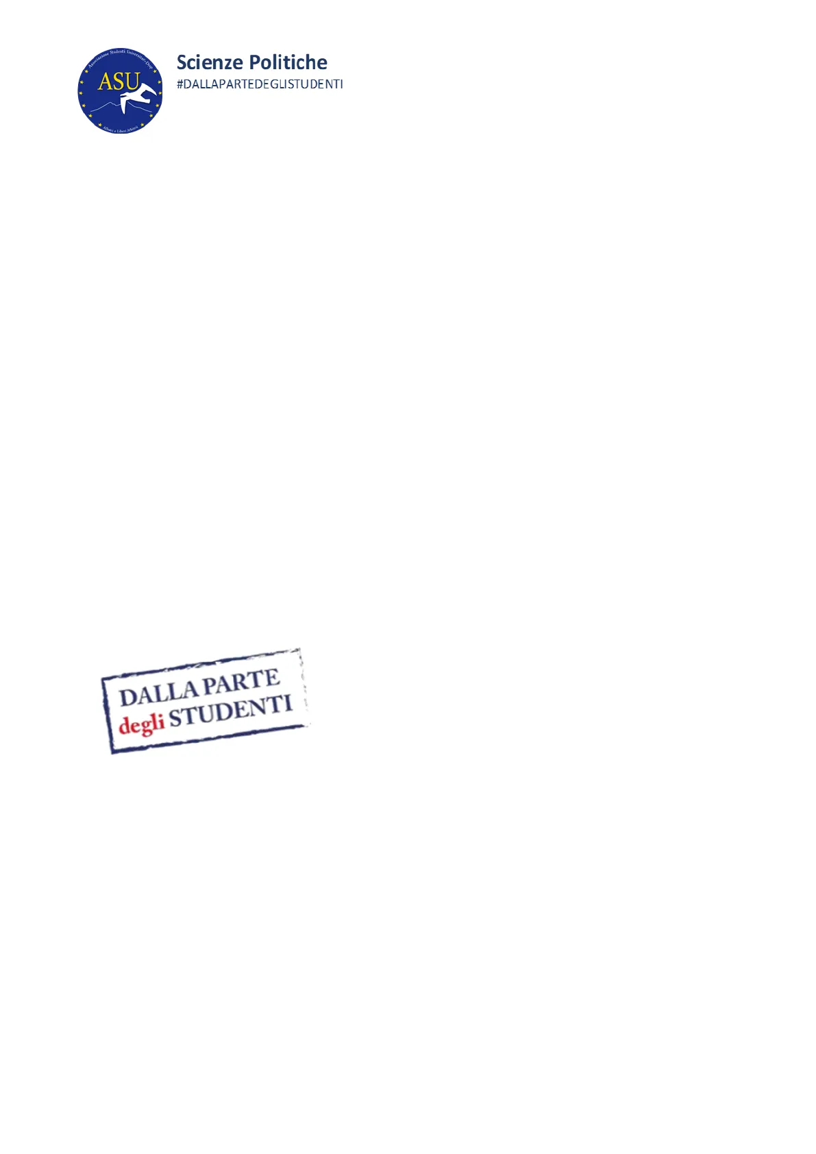ASU Scienze Politiche #DALLAPARTEDEGLISTUDENTI DICHIARAZIONE DI PRINCIPIO: «AVENDO PRIMARIAMENTE A CUORE UNA FORMAZIONE QUANTO MIGLIORE POSSIBILE PER LA COMUNITÀ DEGLI STUDENTI DELL'ATENEO FEDERICIANO, L'ASSOCIAZIONE STUDENTI UNIVERSITARI A.S.U. SCIENZE POLITICHE, PER L'ATTIVITÀ DI STUDIO, CONSIGLIA SEMPRE L'UTILIZZO DEI MANUALI E DEI TESTI UFFICIALI, SICCOME ESSI HANNO L'ESCLUSIVO VANTAGGIO DI ESSERE DI PRECISA QUALITÀ ACCADEMICA E DI FORNIRE, PERTANTO, IL NECESSARIO APPORTO CONTENUTISTICO E LINGUISTICO RISPETTO ALLA MATERIA TRATTATA; QUALITÀ, QUESTA, CHE NON PUÒ ESSERE COMPLETAMENTE SODDISFATTA CON LE COSIDDETTE 'DISPENSE' O CON I 'RIASSUNTI'. TUTTAVIA, AVENDO COSCIENZA DELLE DIVERSE ESIGENZE DIDATTICHE, EVENTUALMENTE SCATURENTI DA ALCUNI STUDENTI, SOVENTE PER MOTIVI "DI TEMPO" O SEMPLICEMENTE "PER SCELTA", LA STESSA ASSOCIAZIONE CI TIENE A METTERE A DISPOSIZIONE DI COSTORO DEL 'MATERIALE DIDATTICO INFORMALE', MA COMUNQUE DI UNA CERTA RELATIVA CURA. ASU CI TIENE A RENDERE NOTO A COLORO I QUALI SI SERVONO DELLE SUE DISPENSE, RIASSUNTI E MATERIALE DIDATTICO INFORMALE, MESSI A DISPOSIZIONE, CHE IL LORO UTILIZZO NON È E NON PUÒ ESSERE ASSOLUTAMENTE SOSTITUTIVO DEI MANUALI E TESTI UFFICIALI. L'ASSOCIAZIONE STUDENTESCA, PERTANTO, SI SPOGLIA DI OGNI RESPONSABILITÀ DIDATTICA, SIA NEI CONFRONTI DEGLI STUDENTI CHE NEI CONFRONTI DEI DOCENTI. IL DIRITTO ALLO STUDIO UNIVERSITARIO CI STA A CUORE». DALLA PARTE degli STUDENTIASU Scienze Politiche #DALLAPARTEDEGLISTUDENTI