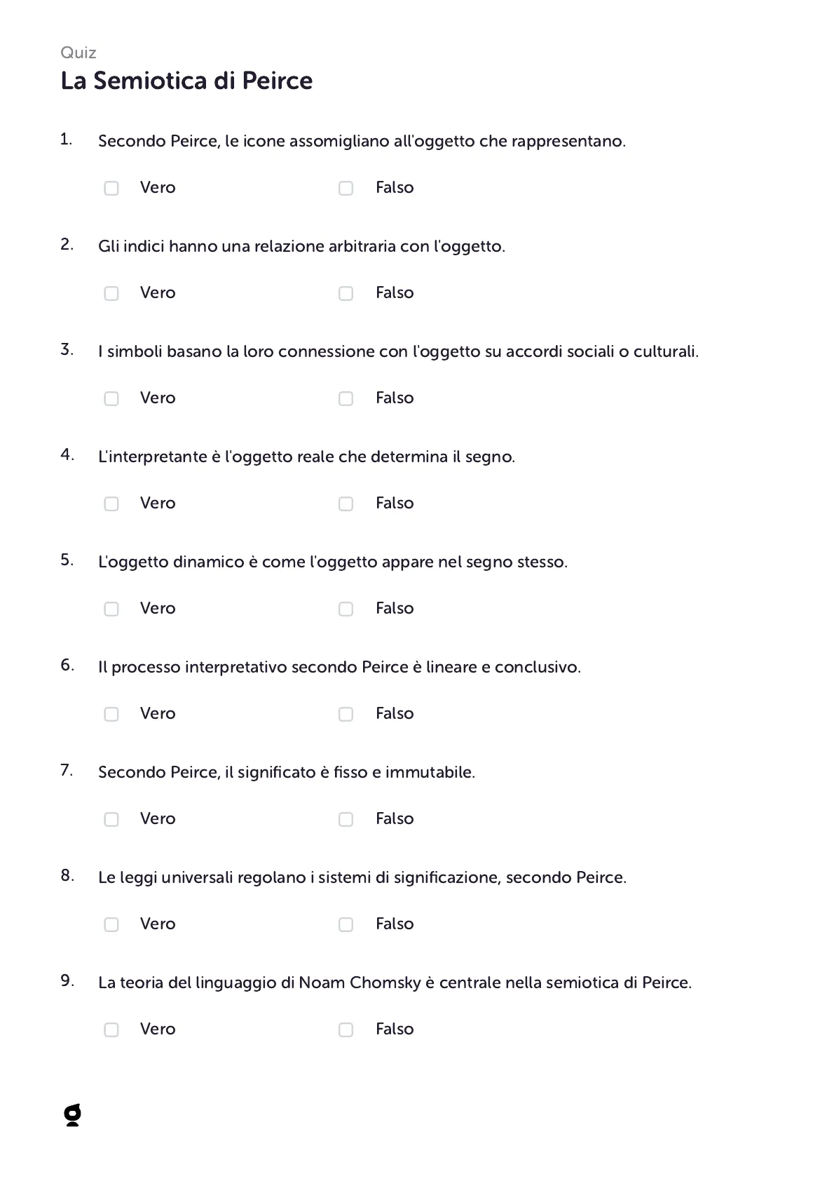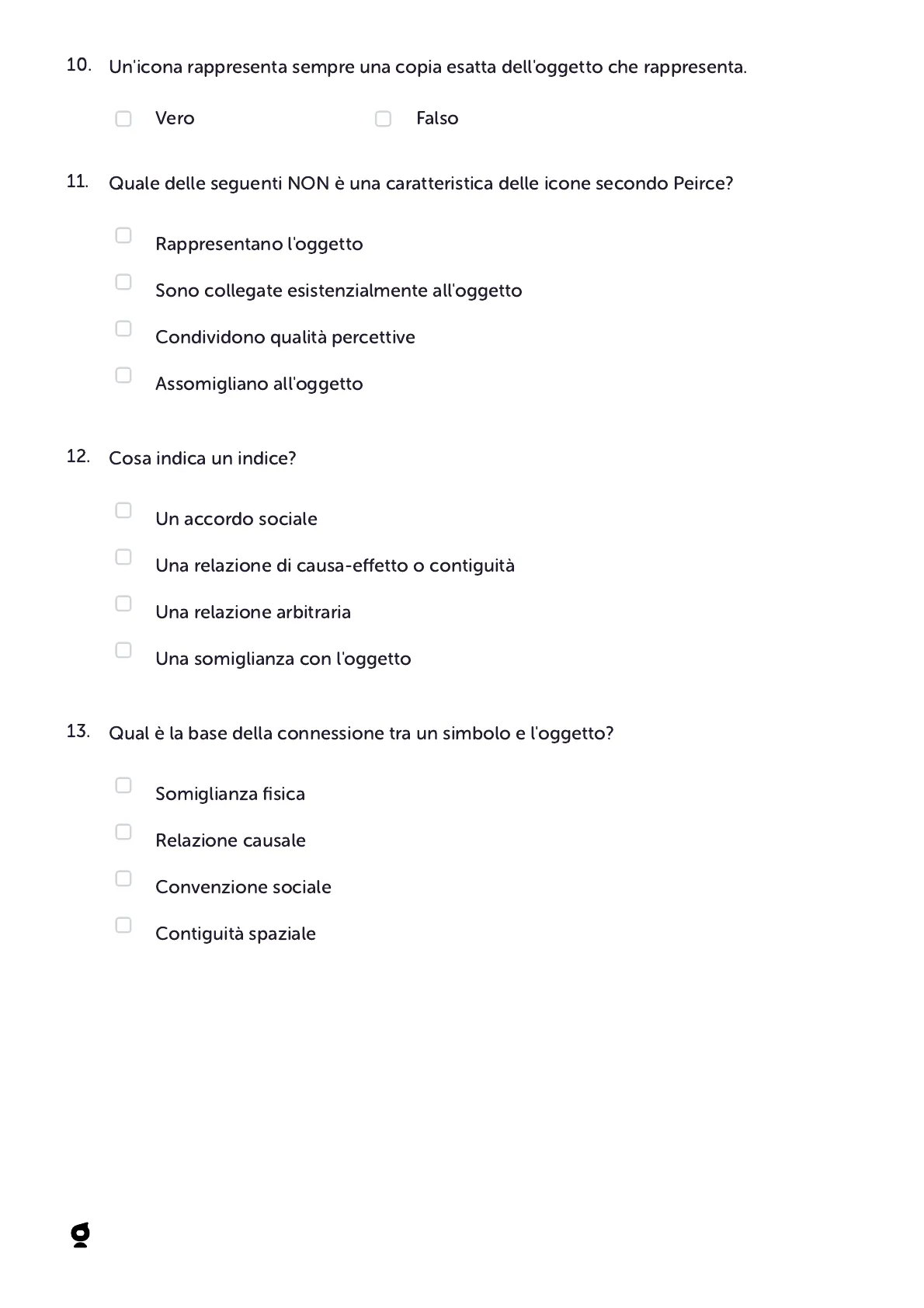 Test dall'Università sulla Semiotica di Peirce. L'Esercitazione è un quiz universitario che copre concetti chiave della semiotica di Charles Sanders Peirce, come icone, indici, simboli, interpretante, oggetto dinamico e oggetto immediato, utile per la verifica dell'apprendimento.