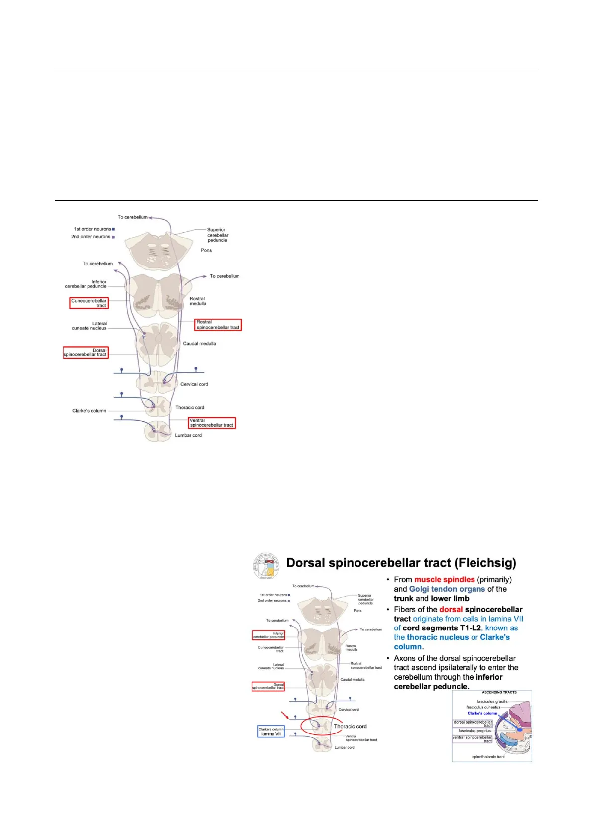 To cerebellum 1st order neurons 2nd order neurons Superior cerebellar peduncle Pons To cerebellum To cerebellum Inferior cerebellar peduncle Cuneocerebellar tract Rostral medulla Lateral cuneate nucleus Rostral spinocerebellar tract Caudal medulla Dorsal spinocerebellar tract Cervical cord Thoracic cord Clarke's column Ventral spinocerebellar tract Lumbar cord