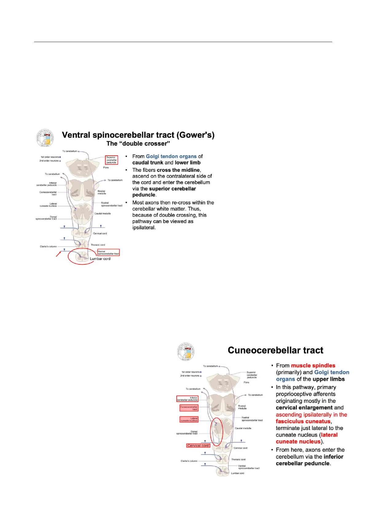 di coordinazione di movimenti, quindi ci aspettiamo che una via spinocerebellare corra ipsilateralmente (che arrivi per esempio nella parte destra del corpo, Cervical cord corra verso l'alto nel lato destro e Thoracic cord raggiunga la metà destra del cervelletto), Clarke's column Ventral spinocerebellar tract invece questa via similmente al tratto Lumbar cord spinotalamico prevede che il neurone centrale porti l'informazione sul lato opposto e salga, raggiunga il peduncolo cerebellare inferiore e continui a salire fino al peduncolo cerebellare superiore. A questo punto attraversa nuovamente la linea mediana annullando l'effetto del primo attraversamento: il tratto spinocerebellare ventrale viene anche chiamato "double crosser" perché incrocia la linea mediana due volte e raggiunge la metà superiore del cervelletto per tornare sullo stesso lato da cui il segnale è entrato (se il segnale arriva dalla metà destra del corpo raggiungerà la metà destra del cervelletto). Questo tratto si chiama ventrale perché nel funicolo laterale lo troviamo nella metà ventrale, cioè più vicina alla linea mediana ventrale, diversamente dal dorsale.