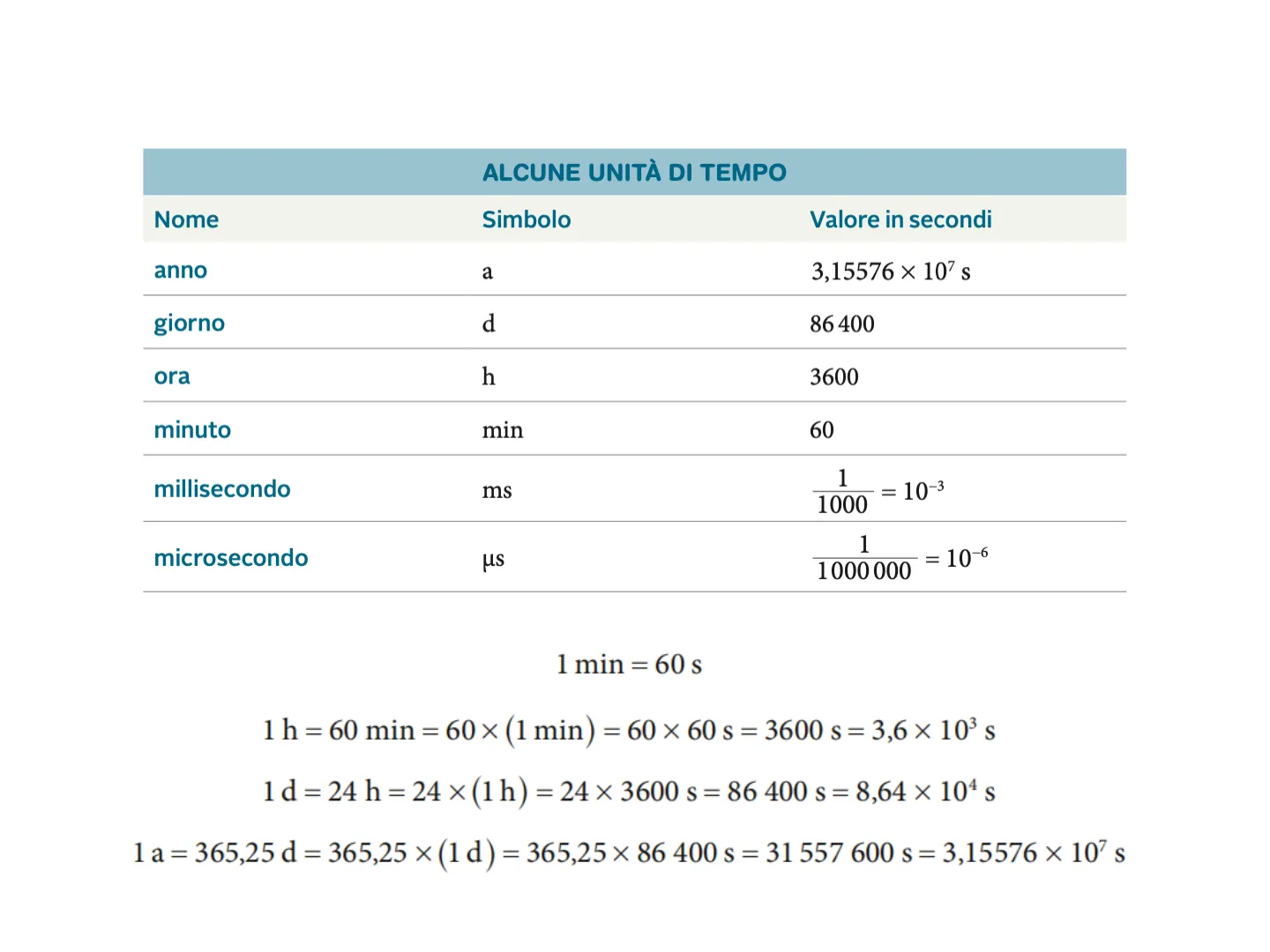Nome Simbolo Valore in secondi anno a 3,15576 × 107 s giorno d 86 400 ora h 3600 minuto min 60 millisecondo ms 1 = 10-3 1000 microsecondo με 1000 000