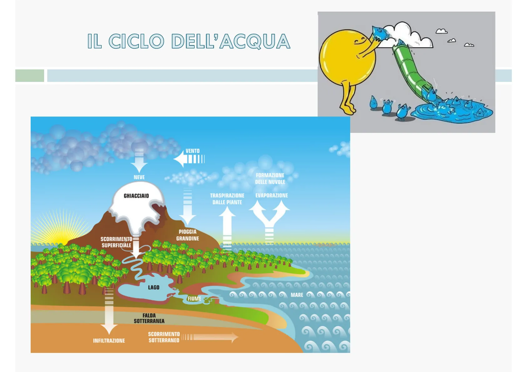 IL CICLO DELL'ACQUA B B 8 VENTO NEVE FORMAZIONE DELLE NUVOLE GHIACCIAIO TRASPIRAZIONE DALLE PIANTE EVAPORAZIONE PIOGGIA GRANDINE SCORRIMENTO SUPERFICIALE LAGO MARE FIUME FALDA SOTTERRANEA INFILTRAZIONE SCORRIMENTO SOTTERRANEO