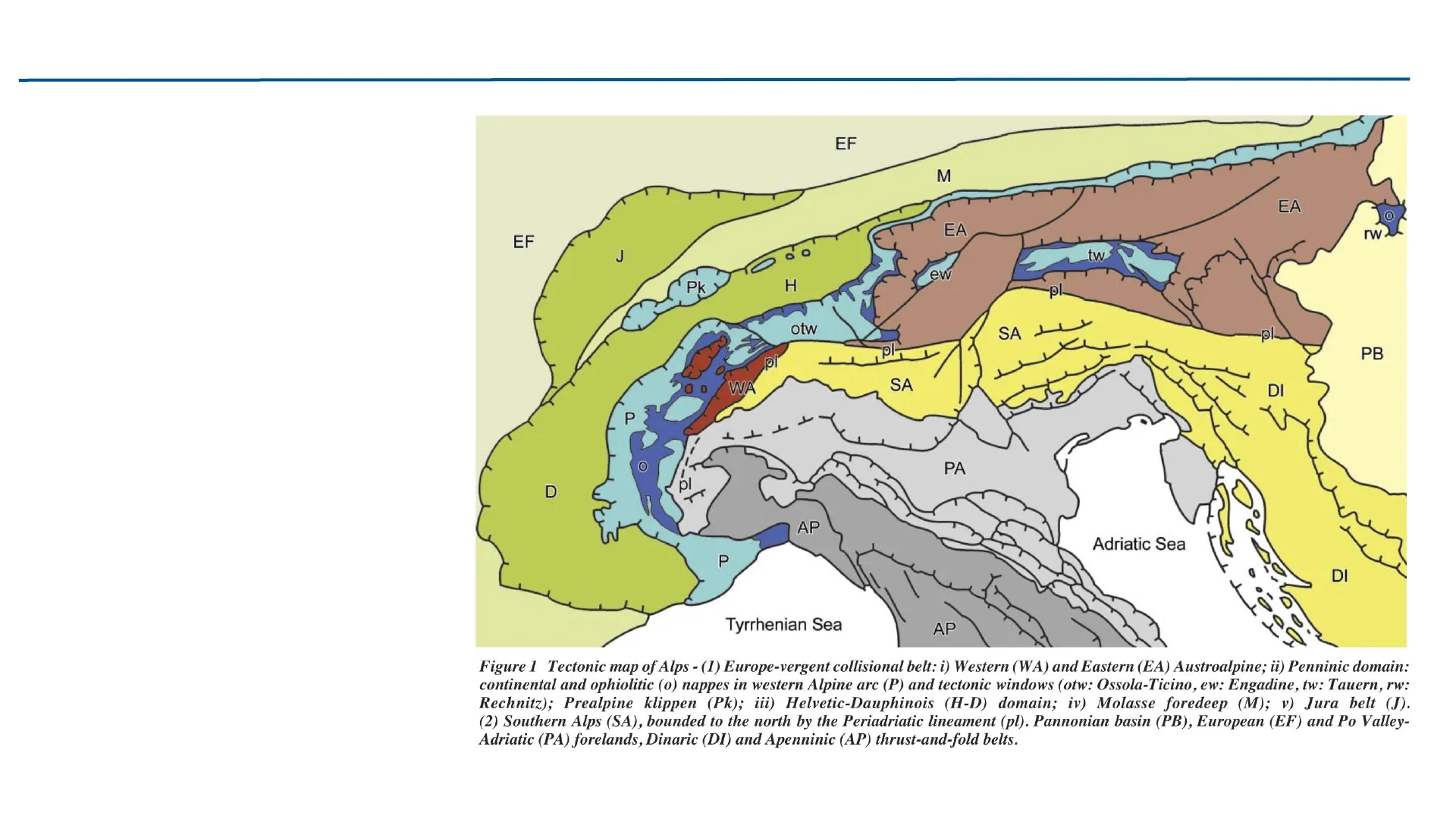 Figure 1 Tectonic map of Alps - (1) Europe-vergent collisional belt: i) Western (WA) and Eastern (EA) Austroalpine; ii) Penninic domain: