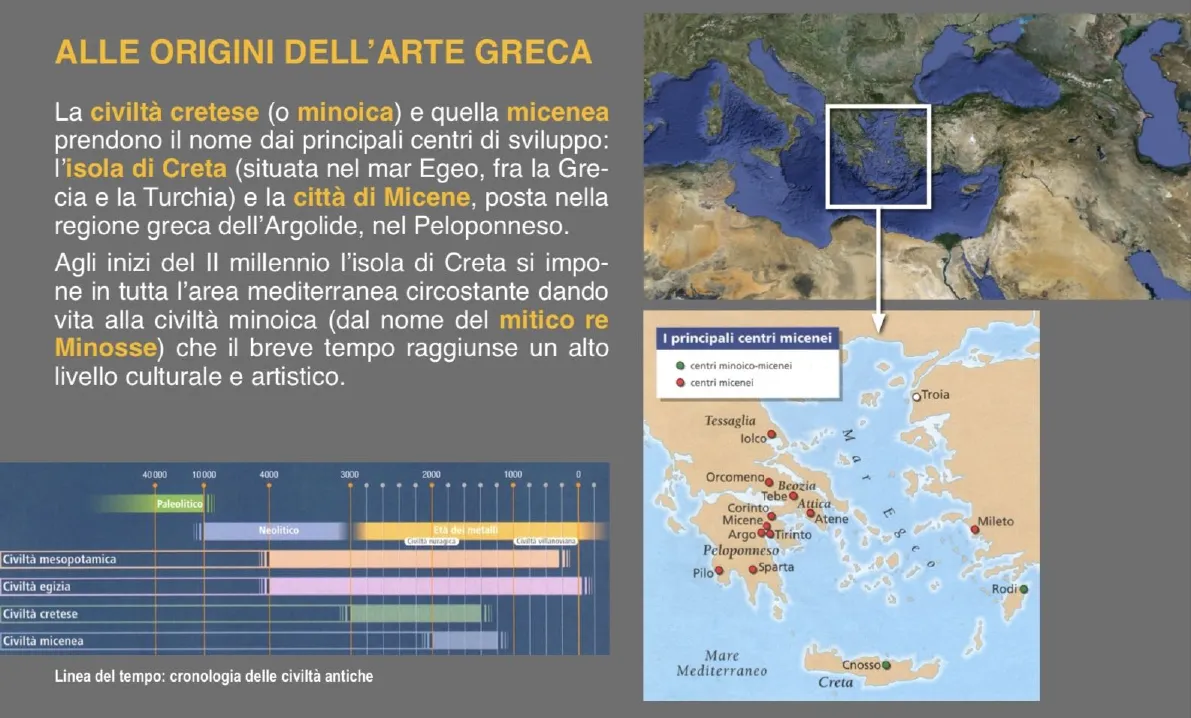 La civiltà cretese (o minoica) e quella micenea prendono il nome dai principali centri di sviluppo: l'isola di Creta (situata nel mar Egeo, fra la Gre- cia e la Turchia) e la città di Micene, posta nella regione greca dell'Argolide, nel Peloponneso. Agli inizi del II millennio l'isola di Creta si impo- ne in tutta l'area mediterranea circostante dando vita alla civiltà minoica (dal nome del mitico re Minosse) che il breve tempo raggiunse un alto livello culturale e artistico.