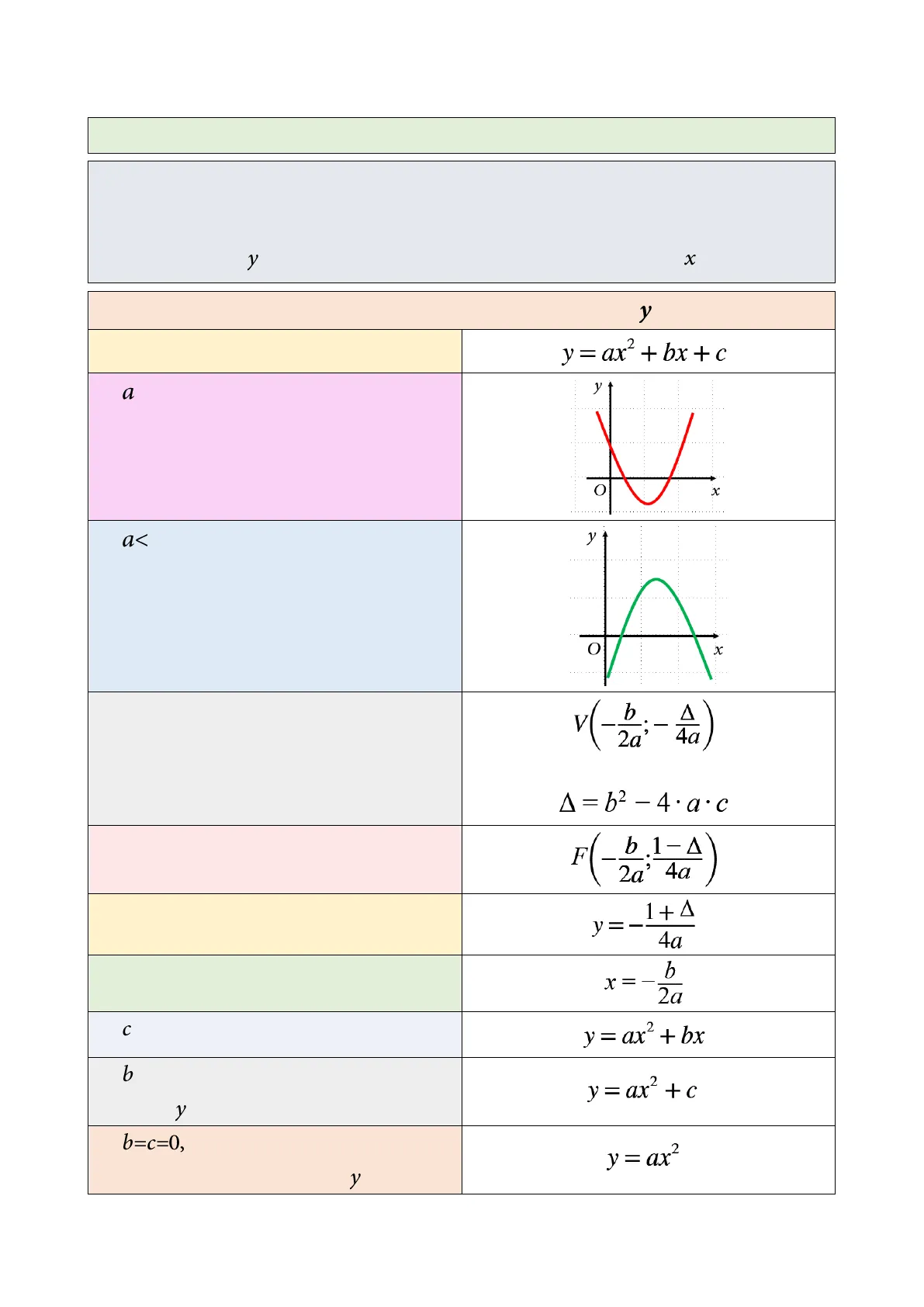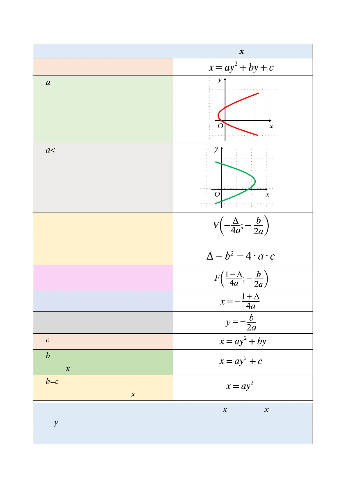 y =- b 2a Se c=0, la parabola passa per l'origine x = ay2 + by Se b=0, la parabola ha vertice e fuoco sull'asse x x=ay- + c Se b=c=0, la parabola ha il vertice nell'origine e fuoco sull'asse x x = ay2 1,2 x Nell'equazione della parabola con asse parallelo all'asse x, si trova la x al posto della y e viceversa, mentre le coordinate dei punti principali sono invertite. Le regole e i procedimenti sono uguali per entrambe.