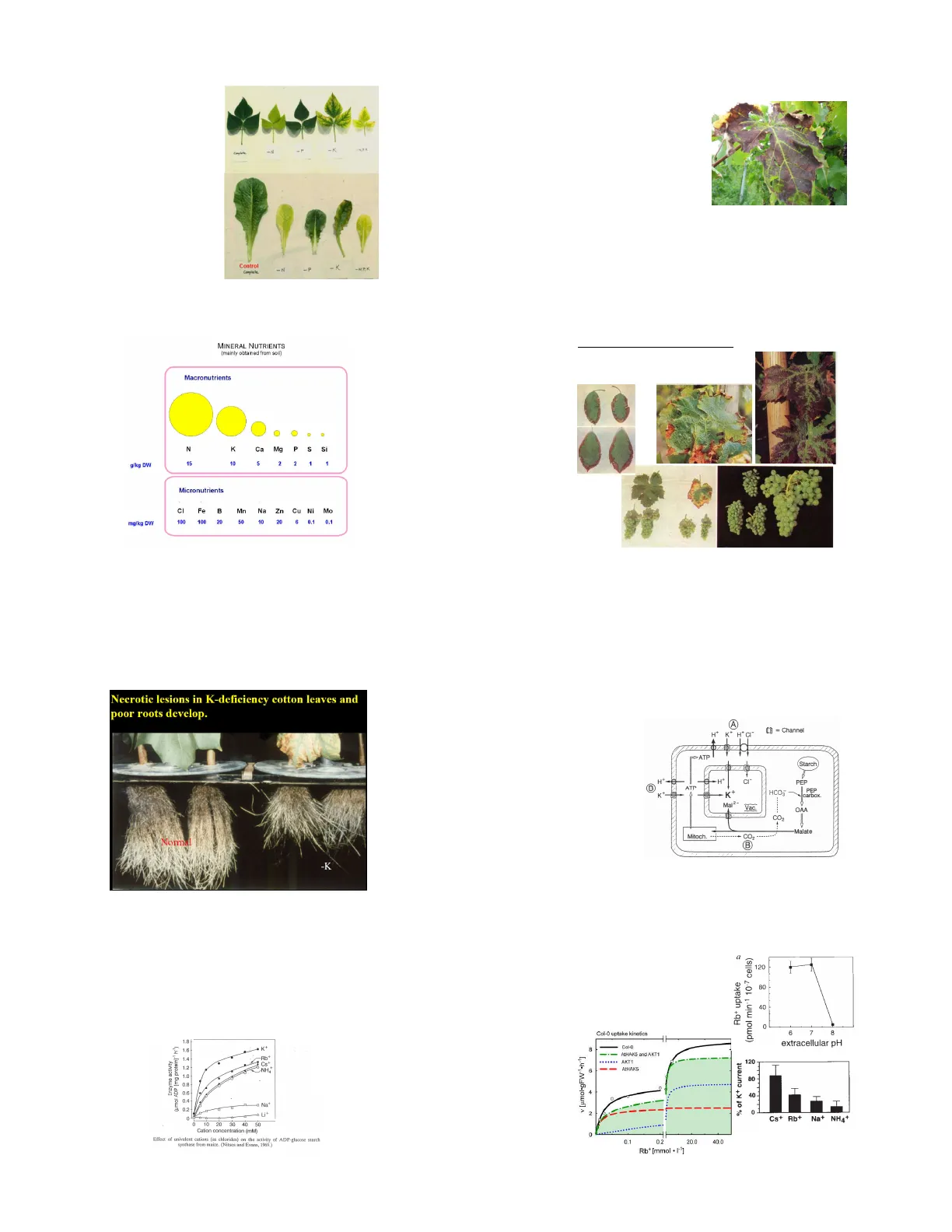 Regolazione osmotica delle cellule, apertura dei stomi, cofattore di numerosi enzimi, caricamento del floema e trasporto, resistenza allo stress. Sintomi di carenza di K: necrosi delle foglie più vecchie 4